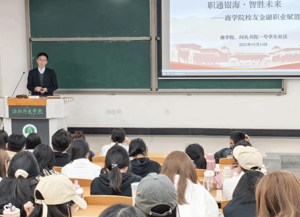 2025年10月14日晚,商学院联合问礼书院一号学生社区在A5-109教室成功举办了一场银行从业经验分享宣讲会。宣讲会由学院党委副书记张瑞萍主持,特邀三位在不同银行领域深耕多年的学长,围绕银行就业形势、岗位入门路径及日常工作内容等方面展开分享。