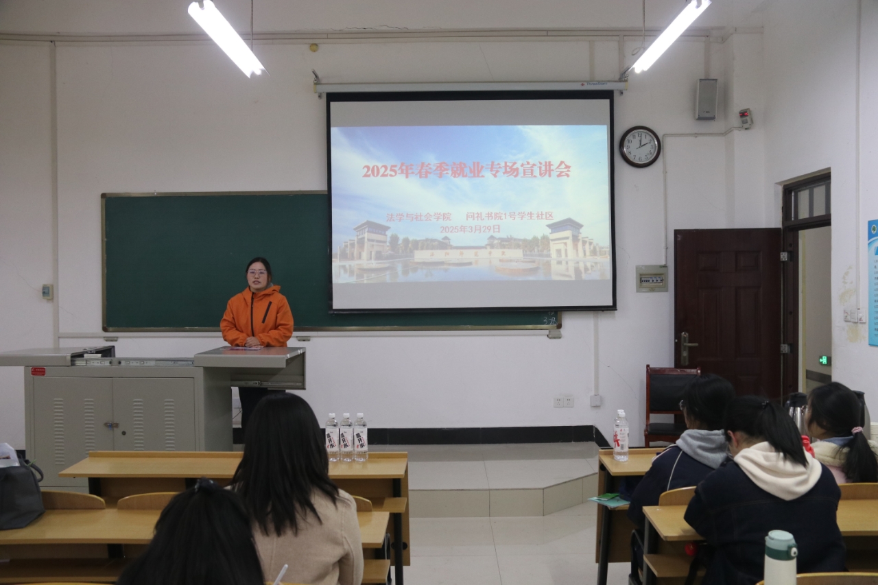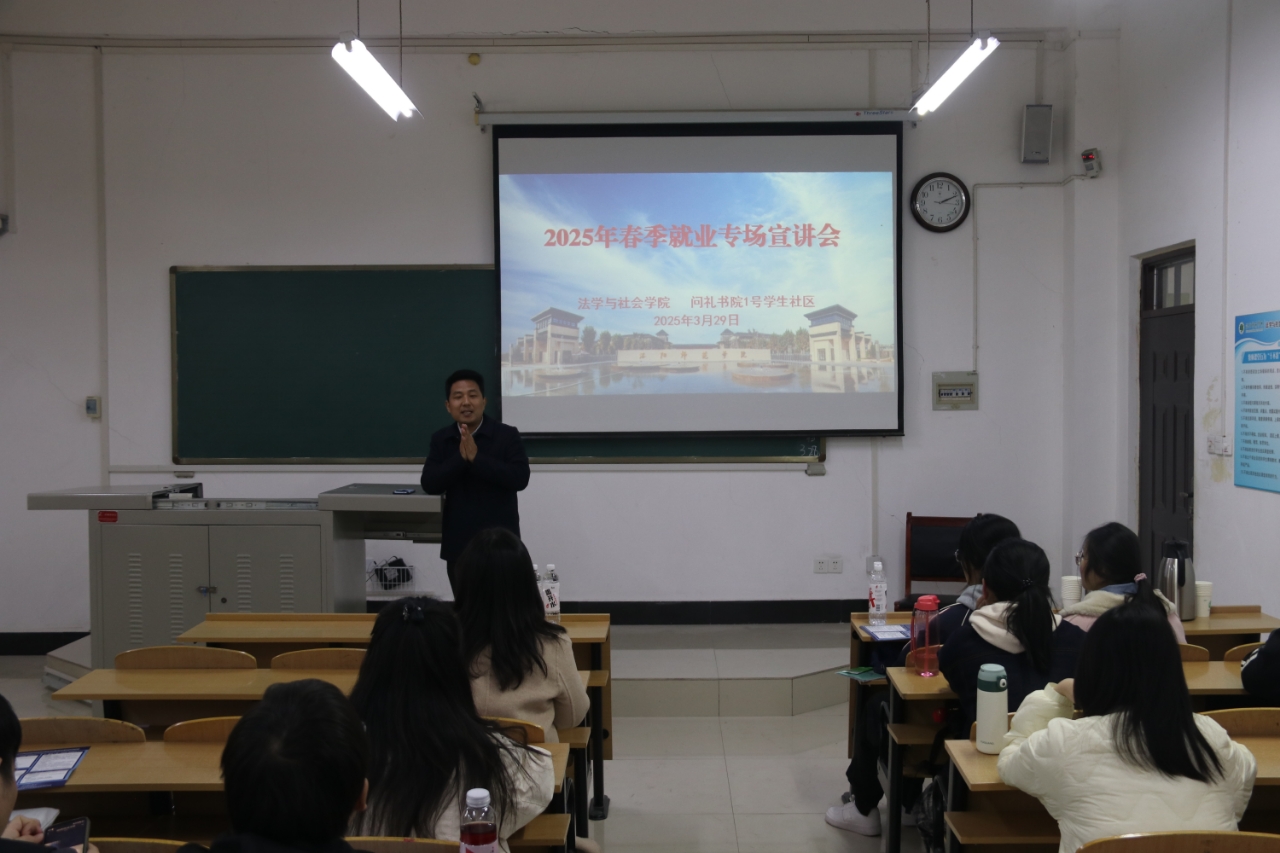 下午,我院邀请河南鹰盾警用装备有限公司和北京中盾(上海)律师事务所两家用人单位在A3-113教室开展就业专场宣讲会,宣讲会由我院就业创业办公室副主任褚畅主持。河南鹰盾警用装备有限公司张钦钦介绍了公司的基本情况,并详细讲解了招聘信息、薪酬待遇等内容;北京中盾(上海)律师事务所律师刘广全向同学们全面介绍了公司的发展规划、人才需求、工作氛围和福利保障等,积极与同学们互动交流,耐心解答问题,并鼓励同学们考取法律职业资格证书。最后,褚畅鼓励同学们不断学习、锻炼自身,努力提升综合竞争力,为未来就业筑牢根基。