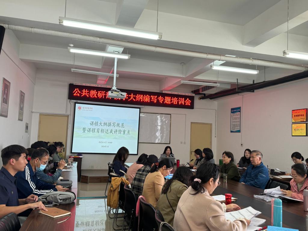 3月28日下午,公共教研部在敦行楼411会议室举行“课程大纲撰写暨课程目标达成评价”专题培训会。本次活动邀请到学校评建办主任孙劭珍老师担任主讲嘉宾,公体部主任赵明、教研室主任、督导组成员以及课程负责人等骨干教师参加了会议。