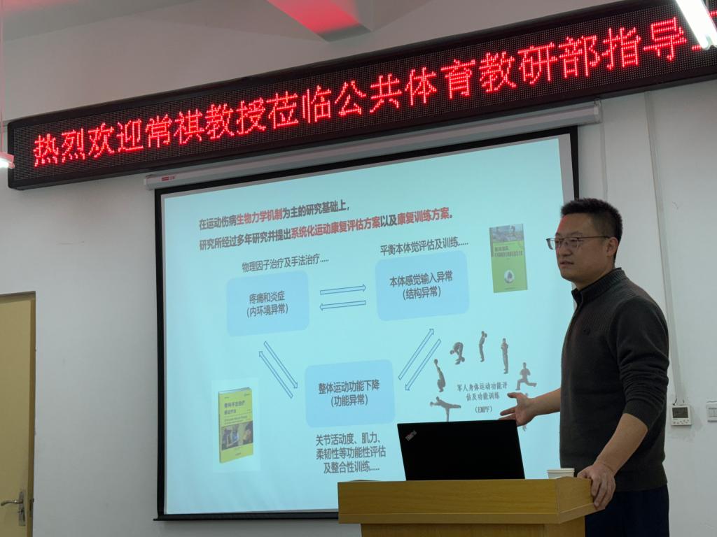 加强体医融合和非医疗健康干预,推动形成体医结合健康服务模式是《“健康中国2030”规划纲要》提出的体育健康工作发展方向。常祺所长从运动损伤形成的运动医学机理谈起,对常见的运动损伤原则、动作模式、功能训练方案等进行了详细介绍。针对体医学科交叉融合的研究方向进行深度剖析,并讲解运动训练学科论文、课题申报书的写作思路与技巧,引导老师们在大学生功能性运动训练方法、运动损伤康复与预防等领域寻找切入点,以期共同推动体医融合背景下学校体育科研工作深层次发展。
