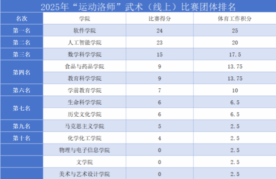 经过激烈角逐,软件学院凭借出色表现荣获团体总分第一名,人工智能学院与数学科学学院分获第二、三名。食品与药品学院、教育科学学院、学前教育学院、生命科学学院、历史文化学院等学院也在比赛中取得优异成绩。比赛还评选出了多名优秀个人选手,其中,教育科学学院智豪龙、人工智能学院张思颍、软件学院田野等同学表现突出,分别在二十四式太极拳和传统太极拳项目中斩获佳绩。