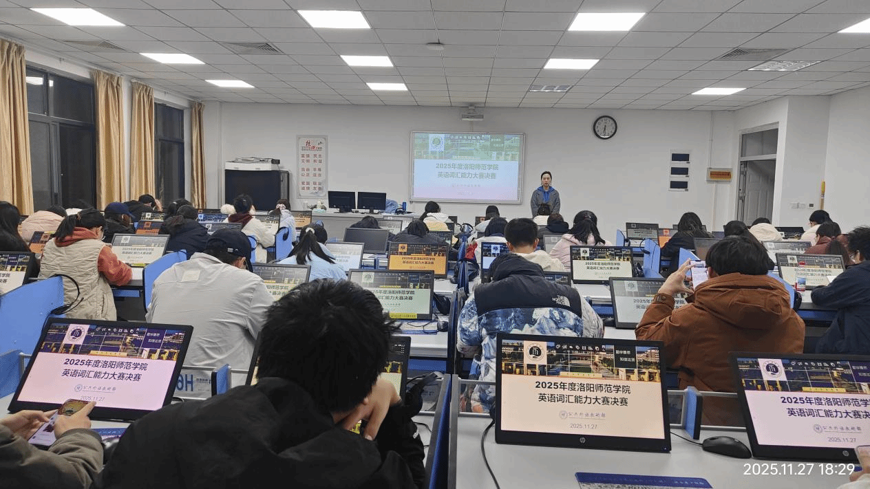 11月27日晚,决赛在G3语言实验室正式举行。入围选手登录“词达人”平台,于规定时间内完成统一命题的词汇能力测试。赛场秩序井然,选手全神贯注,展现出良好的竞赛风貌与扎实的英语基础。系统实时评分,保障了比赛公平、公正与高效。