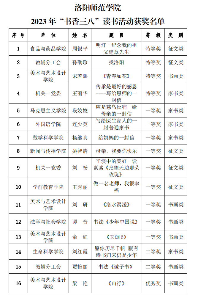 近日,河南省教科文卫体工会通报了2023年“书香三八”读书活动获奖情况,我校16项作品获奖,其中特等奖4项,一等奖9项,二等奖2项,优秀奖1项。