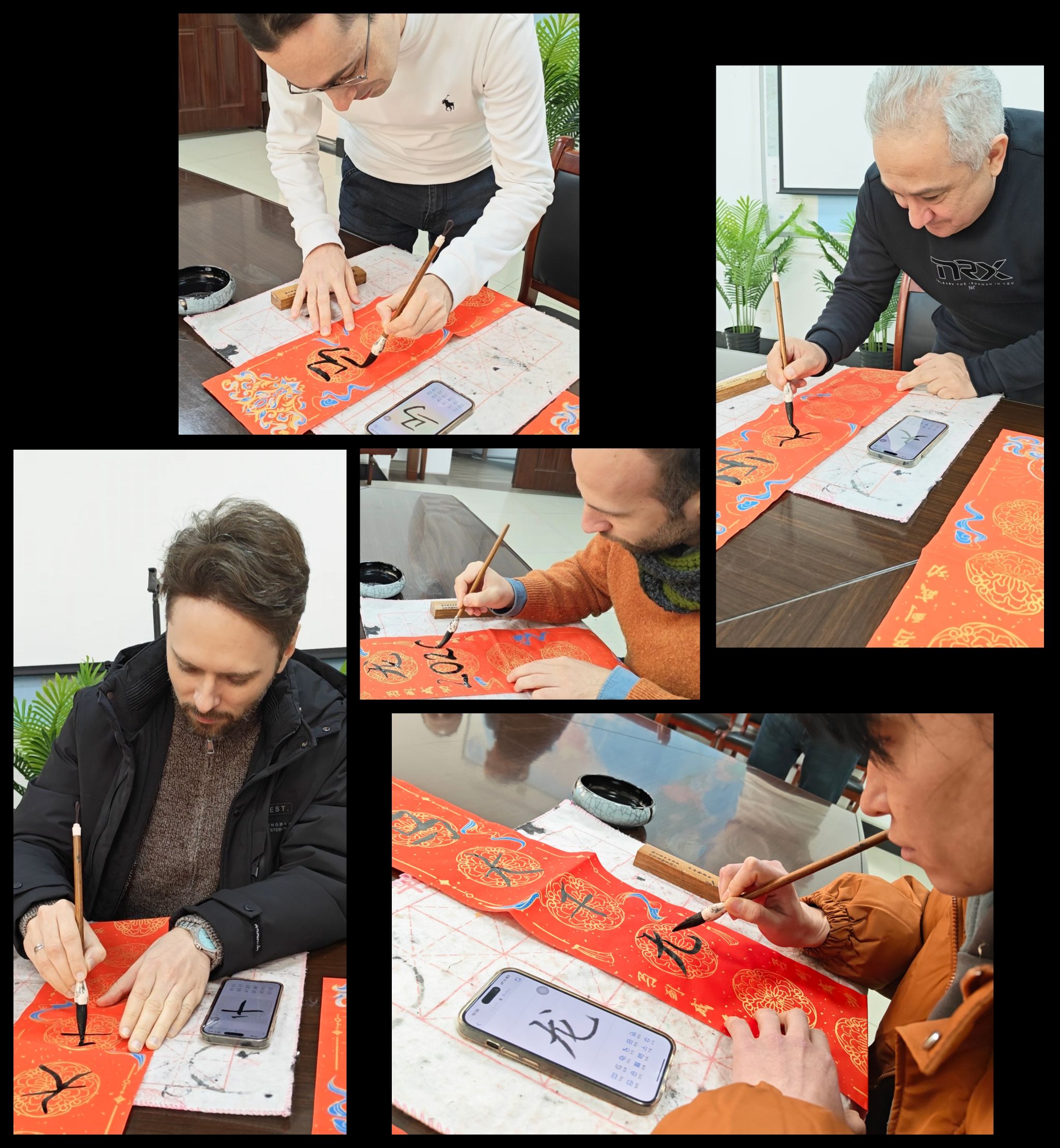 通过图文展示、视频播放等形式,讲解了春节期间的年俗传统,让外籍教师全面了解春节这一中国重要传统节日的文化内涵。通过示范讲解春联的书写技巧与寓意,外籍教师们兴致勃勃地拿起毛笔,在红纸上尝试书写“福”“马”“龙”等汉字。虽然笔触略显生涩,但每位教师都专注投入,墨香四溢的春联承载着对新春的美好期盼。