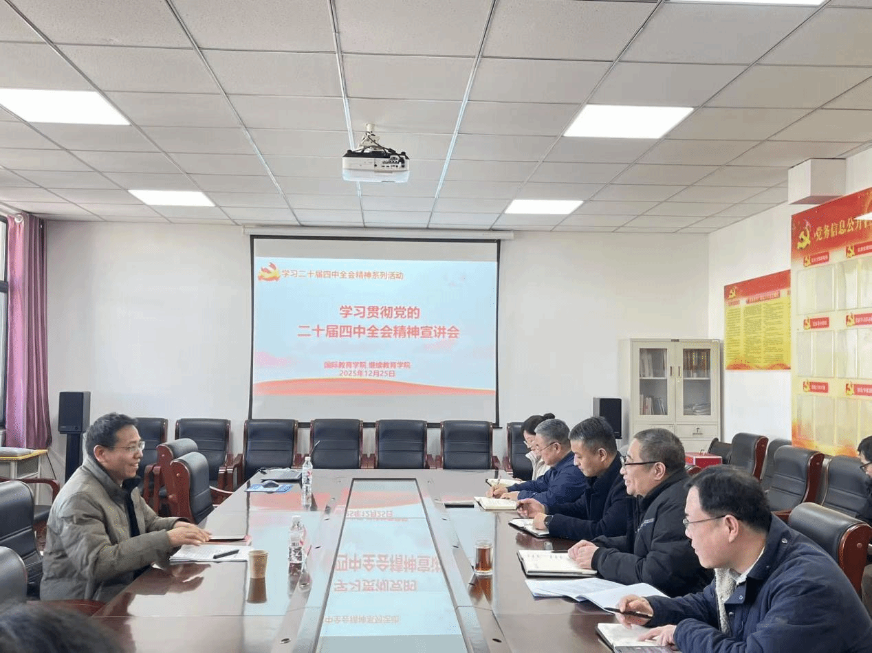 为深入学习贯彻党的二十届四中全会精神,引导教师准确把握国家发展大局与时代使命,12 月 25 日下午,国际教育学院联合继续教育学院专题学习党的二十届四中全会精神。本次学习由马克思主义学院副院长田江太主讲,国际教育学院全体教职工参会。