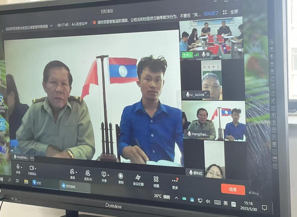 5月30日下午在A1-430会议室,我院召开河洛学院(老挝)分校教学管理工作研讨会。老挝汉澜管理学院党委书记西潘•占塔佩、副院长沈蓬巴色、院务长荷西韩及教师代表通过线上会议出席,洛阳师范学院国际教育学院书记赵峰、院长李华伟、副院长裴航,商学院副院长张舜及教师代表,文学院副院长于涌携汉语国际教育专业教研室老师等参加研讨会。会议由裴航副院长主持。