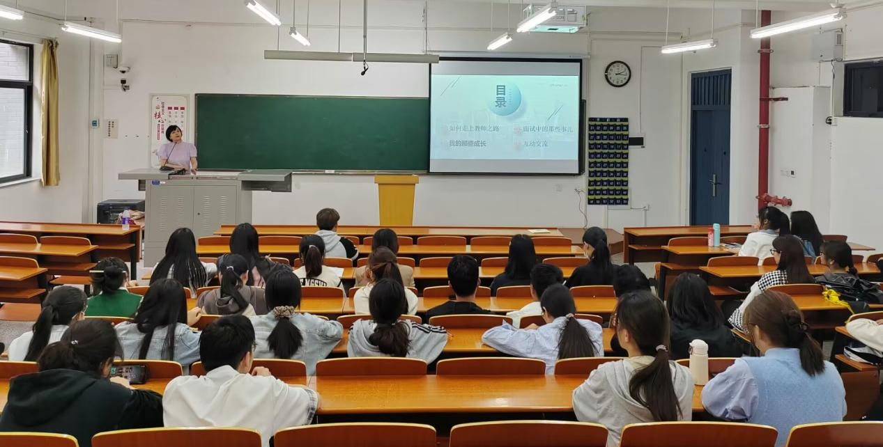 钱晨毕业于洛阳师范学院,在过去的15年教学生涯中,曾获得河南省优质课一等奖、洛阳市教育系统模范工作者等众多奖项。她先以自己成长实例讲起,并从仪表、仪态、语言、流程四个方面详细地介绍教师面试时应注意的细节。她强调,教学特色、教学把握、教学方法是一名老师应具备的基本技能,也是在面试讲课中最重要的内容。接着,她从阅己、越己、悦己三个方向叮嘱同学们认清自己的长处与短板,不断超越自己的极限,打破固有认知的观念,尝试接纳自身的不完美完成成长,才能成为一个有底气、有能力的专业型教师,才能在教师这份工作中实现自我人生价值。活动结束后,同学们与老师亲切的交流了自己的问题。