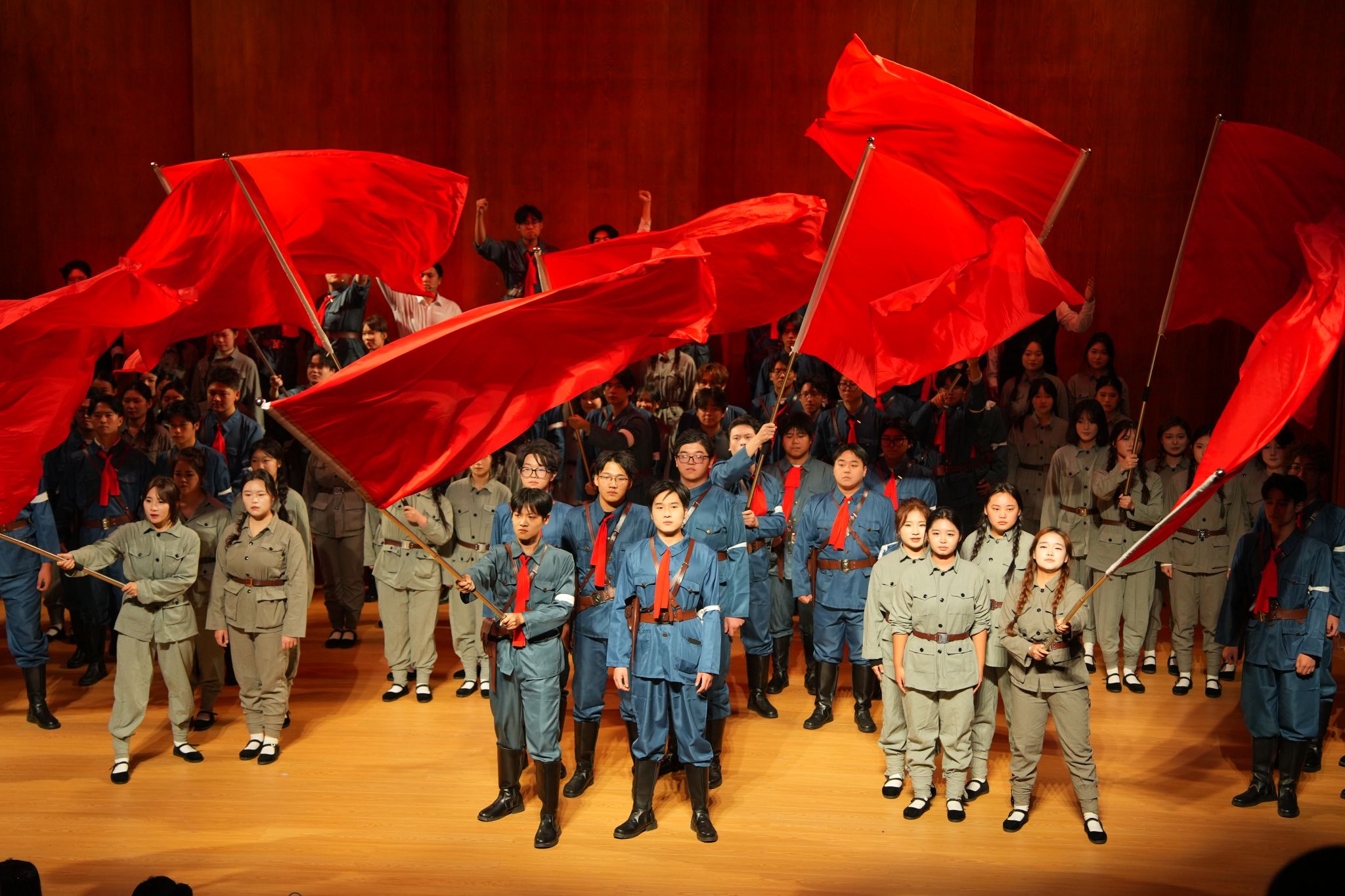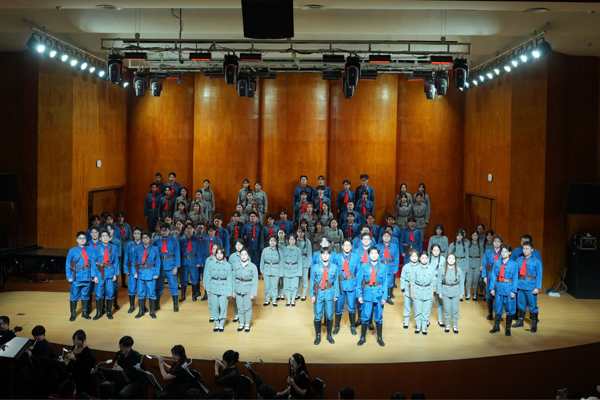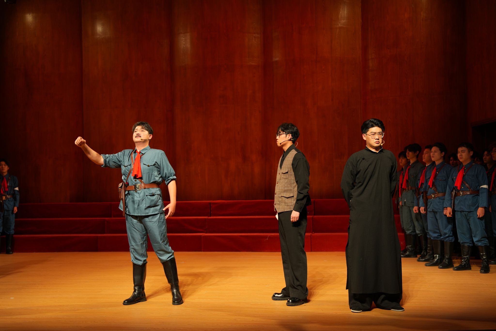 该剧以1927年南昌起义这一重大历史事件为蓝本,通过艺术化手法,勾勒出革命先辈坚守初心使命、勇担时代重任的英雄群像,构筑起一部感天动地的英雄史诗。演出中,由音乐学院学生们饰演的角色演唱的《枪杆子,命根子》《等待这一刻》《往事重现》《我找到了当家人》《我要枪》等“信仰强音”引爆全场共鸣。激昂的演唱、深情的诉说,让观众仿佛穿越时空,沉浸式感受革命先烈的英勇无畏与坚定信念,为全体师生上了一堂立体鲜活的红色教育课。