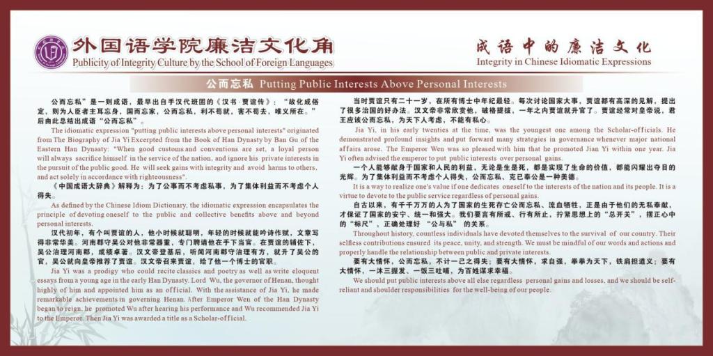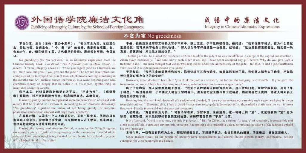 外国语学院党委、纪委通过深入挖掘中华优秀传统文化中的廉洁元素,结合外语专业特点,成功打造了“译”廉筑梦——双语特色清廉文化阵地。