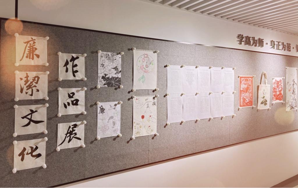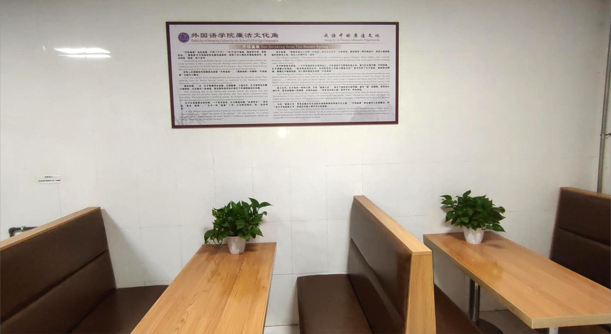 学院在现有的党建活动室资源基础上,建设了廉政书屋,添置20余本廉政专题书籍供师生学习,并在书屋外的墙面设置了廉政文化灯箱,增强廉政文化氛围的营造。此外,学院还在每层教工休息室设置了“清廉文化角”,学院翻译教研室师生共同参与选题、翻译、校对等工作,精选“不贪为宝”“不饮盗泉”等5个廉政主题成语故事,进行中英对照解读,通过展示双语清廉文化故事、廉政标语等,创建了一个集休息、学习、交流于一体的清廉文化空间。同时,学院充分利用问礼书院三号学生社区二楼空间,创设了以清廉、修身、志做“大先生”等为主题的清廉文化长廊,展出师生廉政主题征文、三笔字、剪纸等清廉作品,进一步营造了清廉文化氛围。