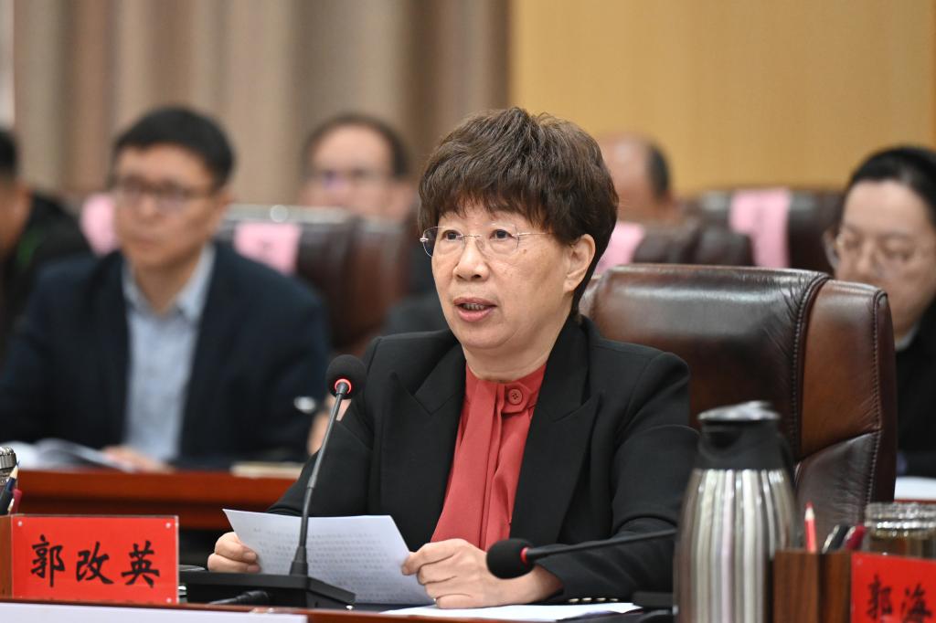 校党委书记郭改英致欢迎词。她代表学校向出席会议的各位专家及领导表示欢迎和感谢,并简要介绍了学校的历史沿革、办学概况和近年来事业发展中取得的突出成绩。她指出,学校党委高度重视审核评估工作,坚持“以评促建、以评促改、以评促管、以评促强”,对标以应用型人才培养为主的指标体系,全面组织开展自评自建,把迎评过程变成深化思想认识、凝聚育人共识的过程,转化为落实立德树人根本任务、推动高质量发展的生动实践。此次审核评估是对学校办学水平和育人体系的一次全面诊断和审视,也是对学校进一步深化教育综合改革、提升人才培养质量的有力指引和促进。学校将全力支持配合专家组的工作,虚心接受专家指导,坚决抓好问题整改,全力推动学校教育教学工作再上新台阶,为教育强国、教育强省建设作出新的更大贡献。