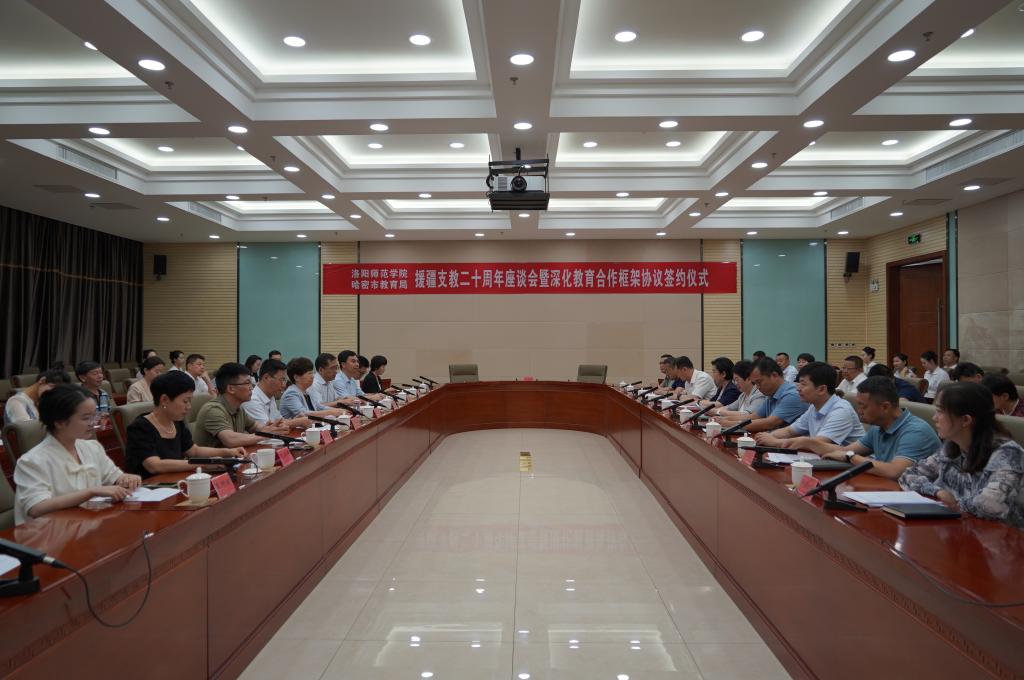 郭改英指出,此次教育援疆20周年座谈会暨合作签约仪式,既是对过去20年教育援疆工作的回顾总结,更是对进一步深化拓展教育援疆工作的谋划和展望。学校将以此为新的起点,牢记“国之大者”,与哈密市委市政府深化教育战略合作,围绕实习支教、师资培训、文化交流、人才培养、科技创新等方面,进一步总结工作经验、固化合作成果,健全工作机制、创新思路举措,强化协同联动、凝聚工作合力,整合优势资源、推动共建共享,共同打造洛哈教育高地,更好地服务哈密市基础教育和社会经济发展,推动我校教育援疆工作再上新台阶、取得新成效。