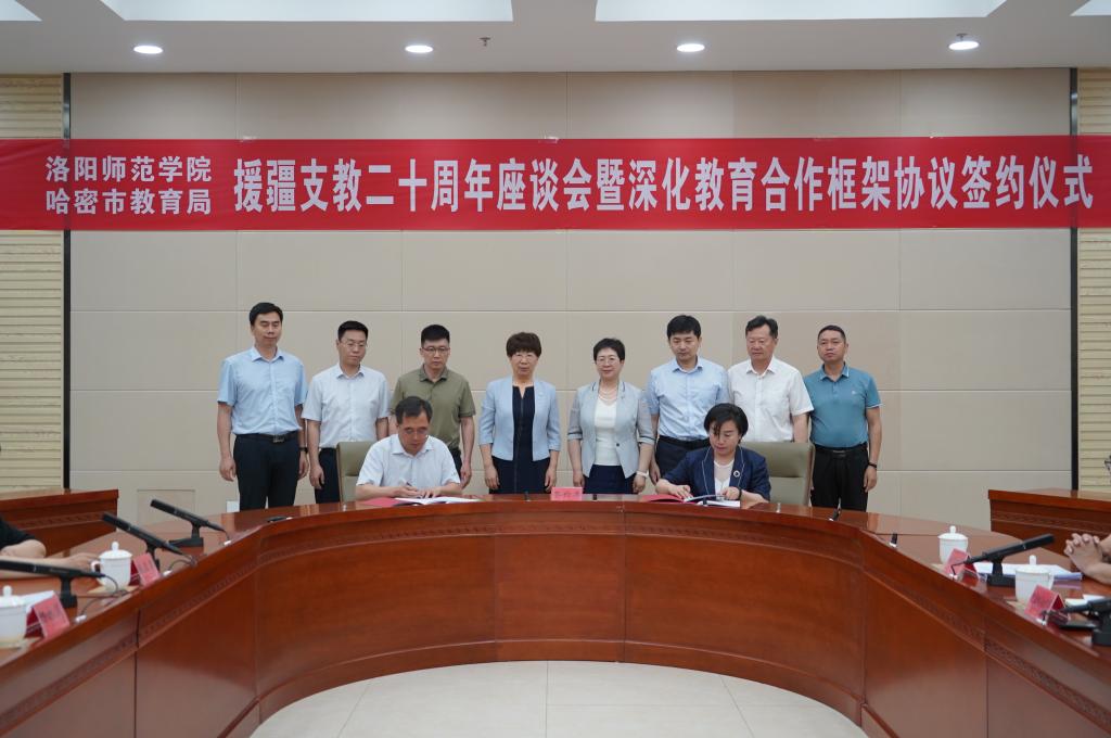 会上,我校与哈密市教育局签署深化教育合作框架协议,郭改英向哈密市第九中学授文化援疆书法工作室牌,马录芳及我校职能部门主要负责同志分别向石油教育分局、哈密市豫哈实验学校、哈密市第十二中学、伊州区地尔班津学校、巴里坤县第一中学授洛阳师范学院大学生实践教育基地牌。