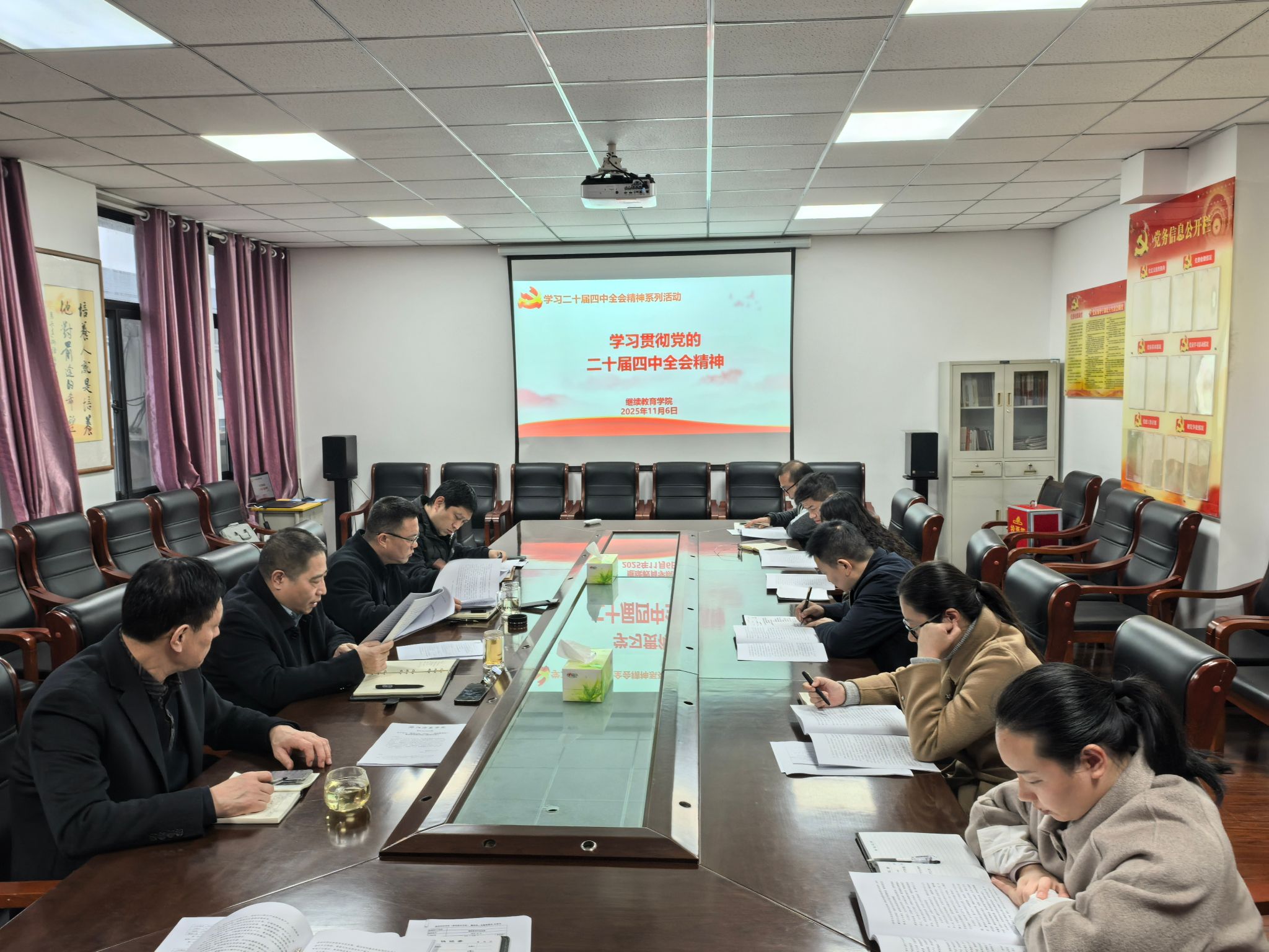 11月6日下午,继续教育学院党总支理论学习中心组专题学习党的二十届四中全会精神。学院理论学习中心组成员参会,全体教职工参加了会议,会议在A6-426举行,由党总支书记何健主持。