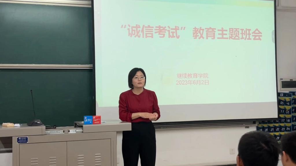 为了督促同学们端正考风考纪、诚信考试,6月2日下午,继续教育学院在A6-324教室召开诚信考试主题教育班会,本次班会由辅导员刘杰老师主持,继续教育学院全体学生参与。
