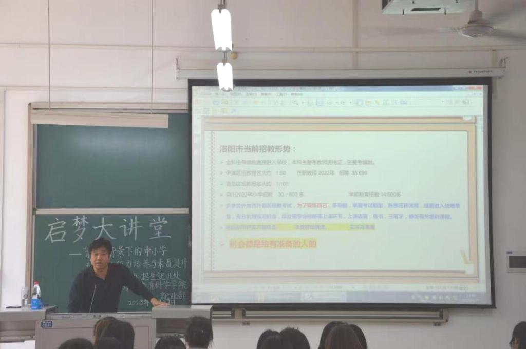 2023年4月27日下午,由招生就业处主办、我院就业部承办的启梦大讲堂A6-103教室举行。洛阳市伊滨区庞村镇中心学校校长、河南省特级教师周文安为学院近百名学生带来题为“招教”背景下的班主任的能力培养与素质提升》的专题讲座。