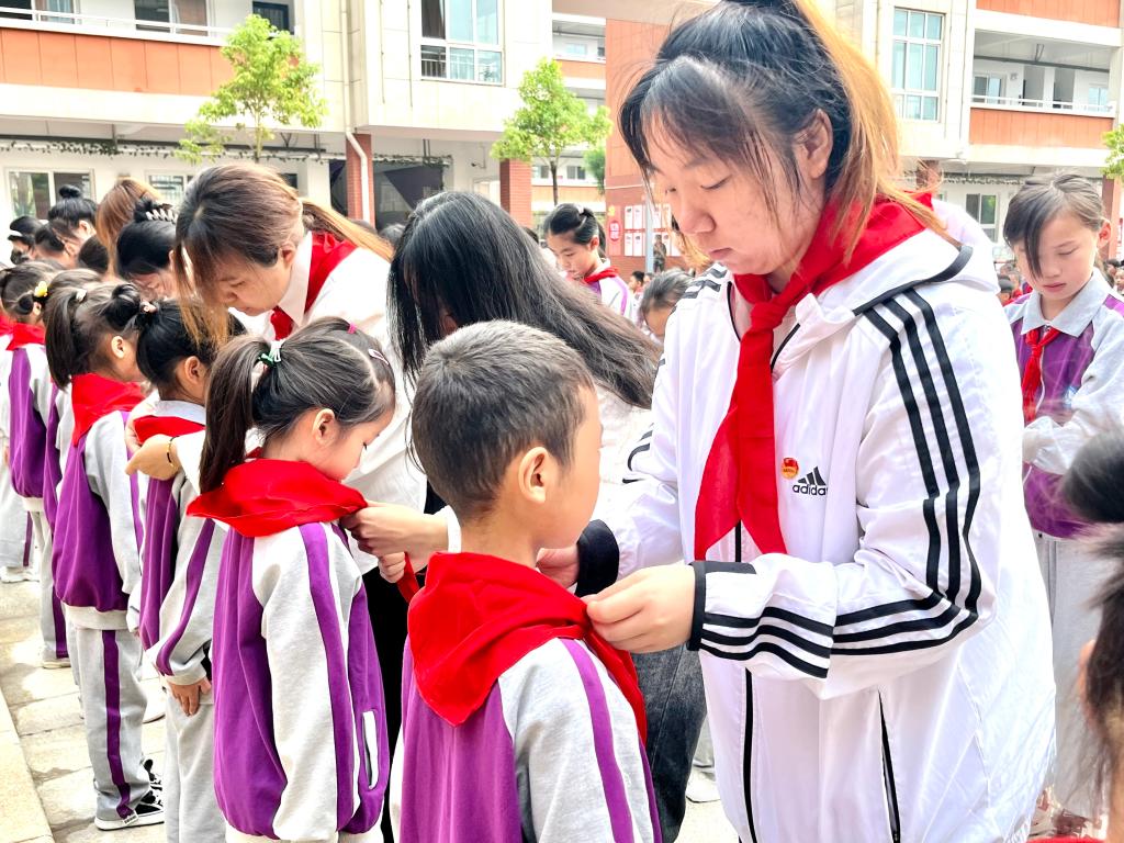 5月30日,我院9名新入团团员参加伊滨区第一实验小学组织的“红领巾心向党”活动。在团旗下,伊滨区一实小相关领导和我院辅导员为新团员佩戴团徽;在队旗下,我院团员代表郑重地为每一位新队员佩戴红领巾,并互敬队礼,彰显了荣耀的传递,象征着党团队薪火相传和责任的嘱托。