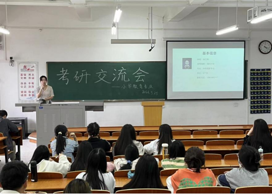 为提高我院学生的考研热情,增强学生的考研信心,协助学生明确考研目标,做好考研规划和安排,小学教育专业于5月25日举办考研交流会。本次交流会特邀吉云帆、张依柳、胡夏三名优秀学生代表进行交流,小学教育系主任郭颖及部分师生代表参与了此次活动。