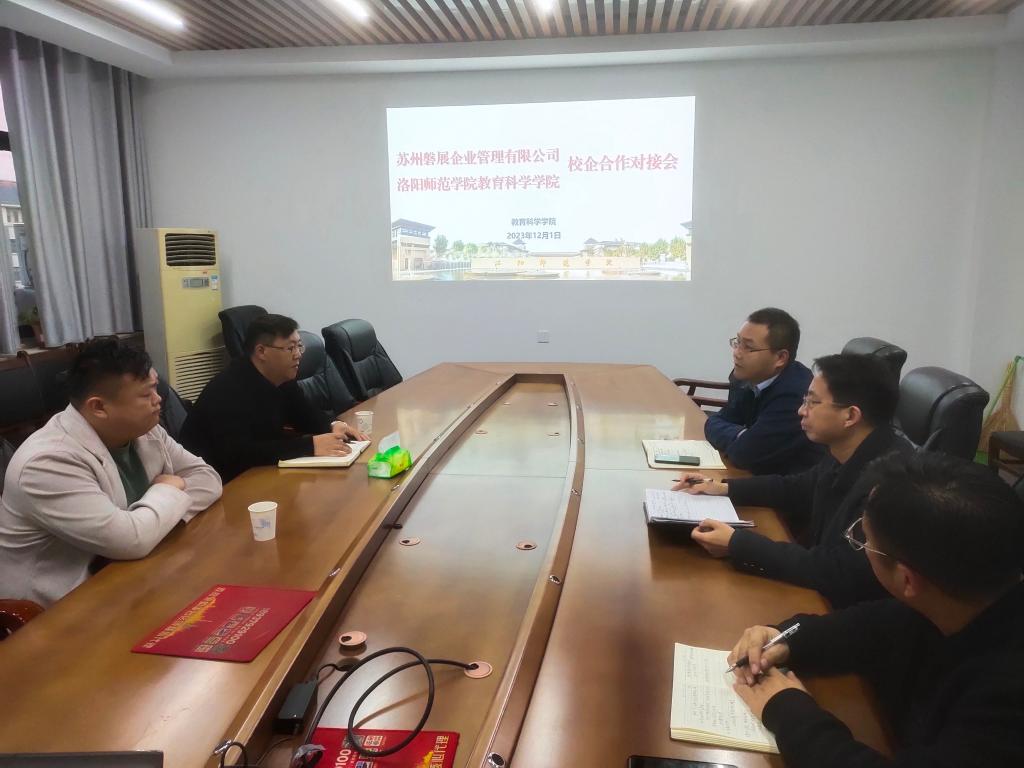 刁鸿安表示学校高度重视校企合作交流,一直以来招生就业处积极推动企业人才需求与学校人才培养进一步融合,从而实现双方互利共赢,共同发展。晋银峰简要介绍了我院办学特色、专业设置及人才培养成效等基本情况,并指出双方要围绕教学、实习、就业等方面开展深度合作。陈磊结合学院2024届毕业生就业工作方案就如何实现资源整合、优势互补、产学共促提出具体建议和措施。企业负责人宋剑飞就企业的发展历程、行业发展、人才需求状况做了一一说明,结合心理学专业毕业生在企业管理、员工招聘、员工关系等工作的特殊优势,希望加强合作,加强企业管理后备人才的培养,并以此为契机,不断扩宽合作领域,强化协同育人,为企业发展培育高质量人才。