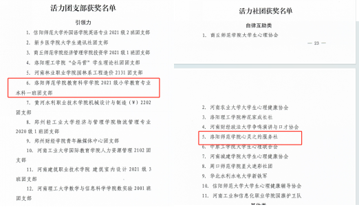 近日,共青团河南省委下发了《关于公布2023年度“活力杯”河南高校共青团基层基础工作大赛获奖名单的通知》,我院2021级小学教育专业本科一班团支部、心灵之约服务社分别荣获2023年度河南省“活力杯”活力团支部、社团。
