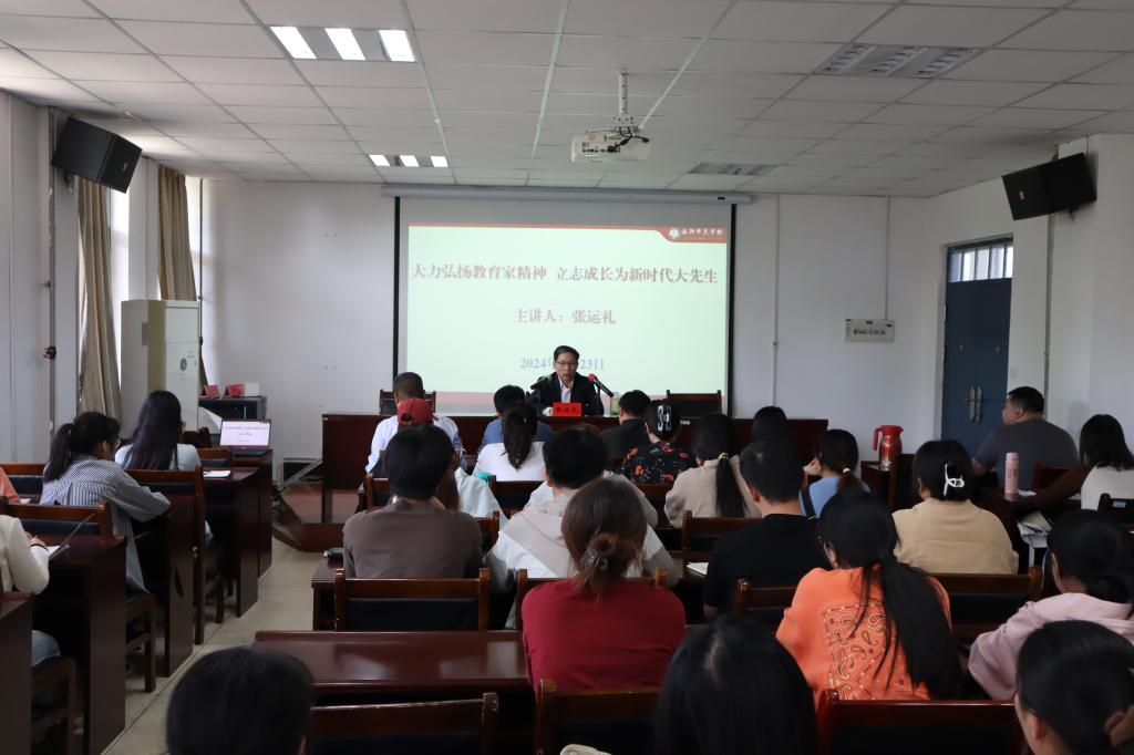 4月23日下午,校党委副书记张运礼在A6-416会议室以《大力弘扬教育家精神 立志成长为新时代大先生》为题,为问礼书院二号院师生代表讲授思政课。问礼书院二号院领导班子、育人导师和学前教育、小学教育专业学生代表等60余人同上思政课。