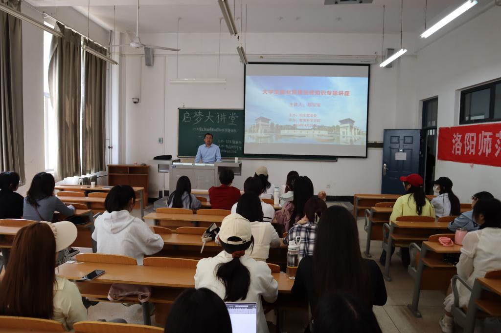 4月25日下午,由招生就业处主办,教育科学学院承办的启梦大讲堂系列讲座之“毕业生就业相关法律知识”在A6-116教室举行。本次讲座特邀河南都典律师事务所郑宝宝律师主讲,我院党委副书记韩守东、毕业班辅导员、毕业班学生代表参会。