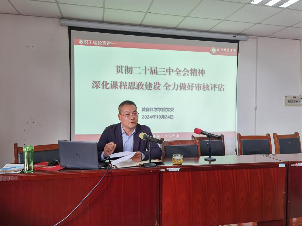 10月24日下午,学院党委书记陈磊以“贯彻党的二十届三中全会精神,深化课程思政建设,全力做好审核评估”为题,在A6-416会议室为学院教职工做理论宣讲。