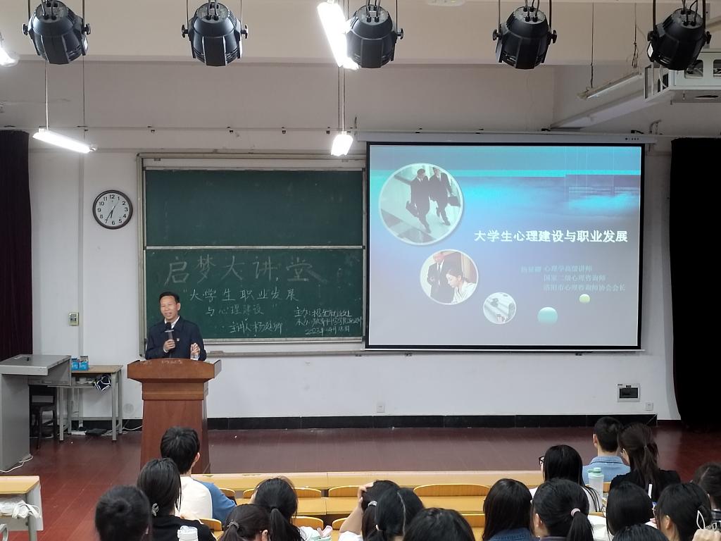 4月18日晚,由校招生就业处主办,教育科学学院承办的启梦大讲堂在教育科学学院A6-116举行。河南省政协委员、洛阳市心理咨询师协会党支部书记、会长杨延卿为学院各年级近百名学生作了题为“大学生心理建设与职业发展”的报告。