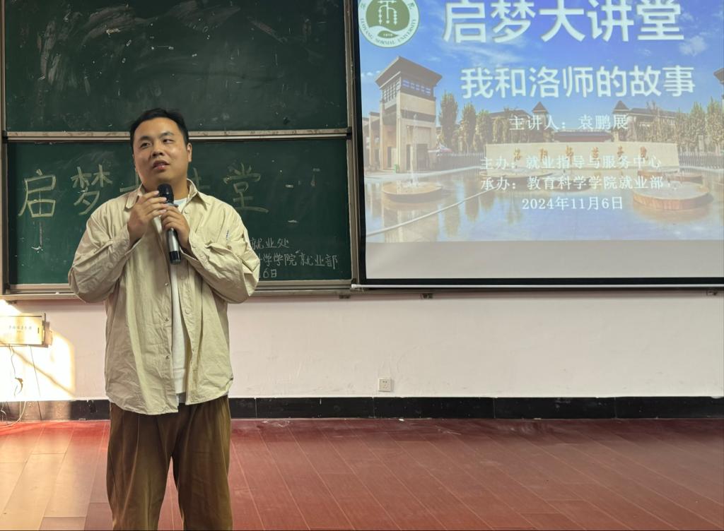 2024年11月6日,由招生就业处主办、教育科学学院承办的启梦大讲堂在A6-116教室举办。本次活动邀请我院2019届优秀毕业生,洛阳职业技术学院教师袁鹏展担任主讲,我院教育学专业100余名学生参与。