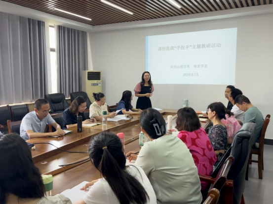 6月13日下午,我院教育学系、应用心理学系在A6-411会议室联合开展课程思政公开课观摩教研活动。本次活动由应用心理学系教师徐晓芳讲授观摩课程,教育学系主任白文昊主持,教育学系、应用心理学系全体教师参加。