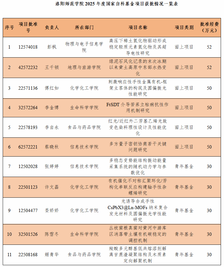 日前,国家自然科学基金委员会发布了《关于2025年国家自然科学基金集中接收申请项目评审结果的通告》。我校共有11个项目获得资助,其中面上基金6项,青年基金5项,直接资助经费454万元,立项数量和资助经费较去年同期分别增长37.5%和52.6%,立项数量位列河南省高校第15位。