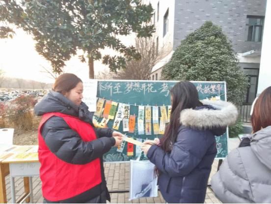 活动现场,一张张设计精致的书签被整齐地陈列在展台上,淡雅的纸张上或印着励志的箴言,或留着空白的书写区域,每一张都承载着浓浓的期许与祝福。来往的同学纷纷驻足,有序领取心仪的书签,不少人还特意拿起笔,在书签上写下自己的暖心寄语——有人送上“落笔生花,圆梦今夏”的祈愿,有人留下“此去乘风,一举成功”的鼓励,将这份真诚的心意传递给即将奔赴考场的考研学子。小小的书签虽轻薄无重,却凝聚着书院师生满满的关怀与支持,它就像寒冬里的一簇簇星火,化作一股温暖而坚定的力量,陪伴着日夜苦读的考研学子披荆斩棘,坚定地走向属于自己的那片山海。