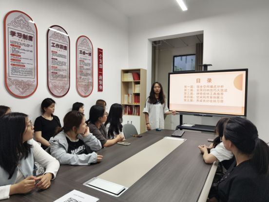 活动伊始,吕卓洋以“整理的不只是空间而是与生活对话的方式”为引,点明活动主旨。学生代表杨粟淇、张蕊欣结合日常收纳场景,通过实际案例分析,分享了衣柜分区收纳、书桌杂物归类等实用技巧,并现场演示“三步叠衣法”,从“断舍离”理念到具体空间规划方法,为在场的学生提供了可行实用的收纳方案。此外,生活导师董玉苹结合丰富经验,为大家传授了常见生活问题的处理方式和生活小妙招。