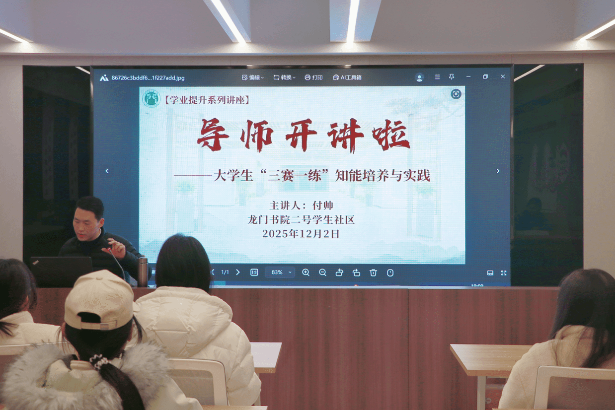 为提升学生学科竞赛备赛能力,精进专业竞赛综合实践运用技巧,12月2日晚7点,龙门书院二号学生社区开展《大学生“三赛一练”知能培养与实践》专题讲座,本次讲座由学业导师付帅主讲,书院社区学生代表参加。