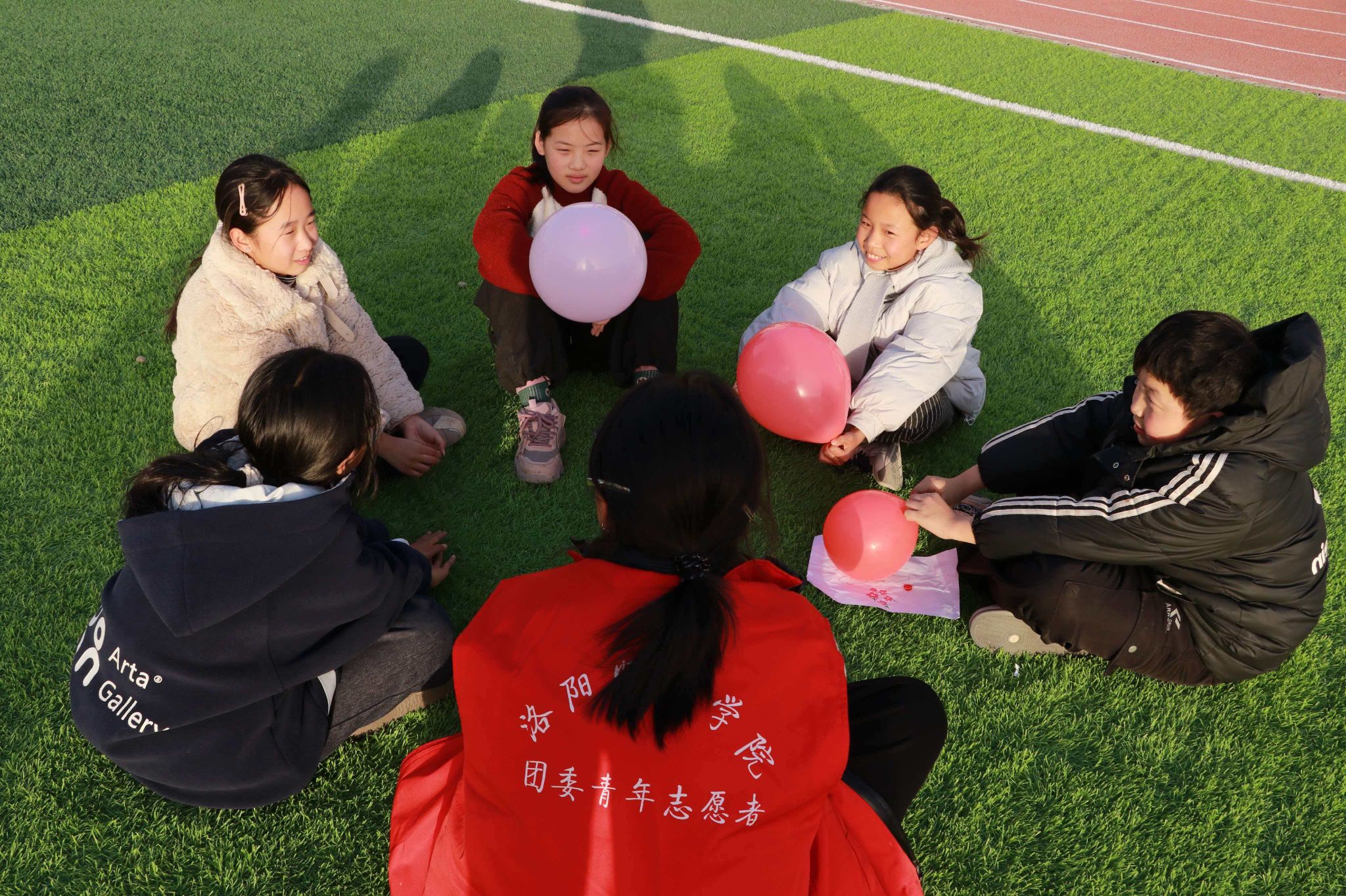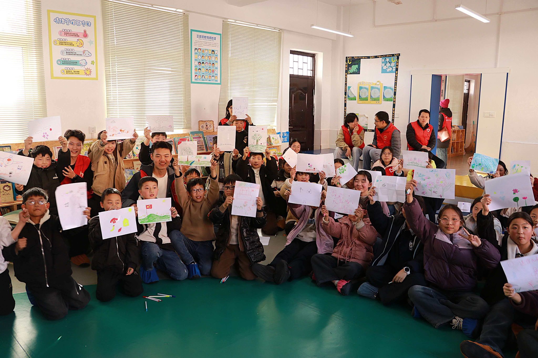 活动筹备期间,新闻与传播学院教工党支部积极牵头,龙门书院二号学生社区团委广泛动员,面向全校发起爱心募捐倡议,得到近千名学生的积极响应。活动累计募集课外读物421本、文具1099份、体育用品35套。活动当天,师生代表一行抵达道兴小学,志愿者们将捐赠物资一一搬运至校园。孩子们好奇地围拢过来,篮球、足球刚一摆放整齐,男孩们便忍不住轻抚球面;文具与书籍整齐装箱,一位小女孩踮脚望向童话书封面,眼中闪烁着期盼的光芒。在心理团辅环节,孩子们在志愿者陪伴下执笔涂鸦、参与游戏,现场气氛温馨活跃。一位小女孩为画中志愿者的衣服涂上彩虹色后,轻声问道:“姐姐,你以后还会来吗?”活动尾声,10名志愿者与10名孩子现场签订“大手拉小手”一对一帮扶协议,建立为期一年的陪伴关系。一位小男孩悄悄拉住结对志愿者的手说:“我以后可以把考试卷子寄给你看吗?”质朴的话语,传递出孩子们对持续关怀的渴望与信任,也彰显了长效陪伴的深远意义。