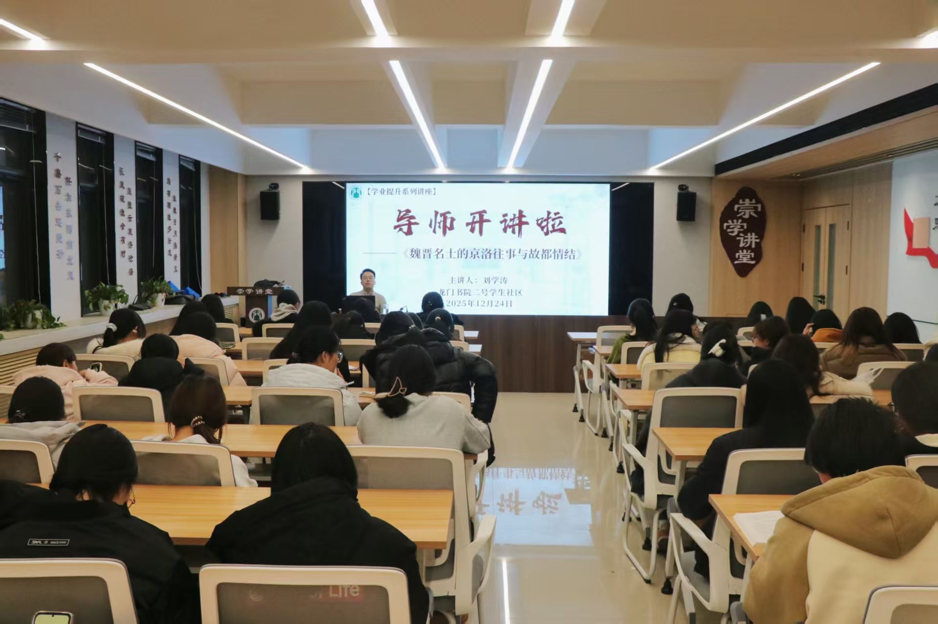 12月24日晚,龙门书院二号学生社区于崇学讲堂开展“魏晋名士的京洛往事与故都情结”专题讲座,本次讲座由学业导师刘学涛主讲,书院学生代表到场聆听。