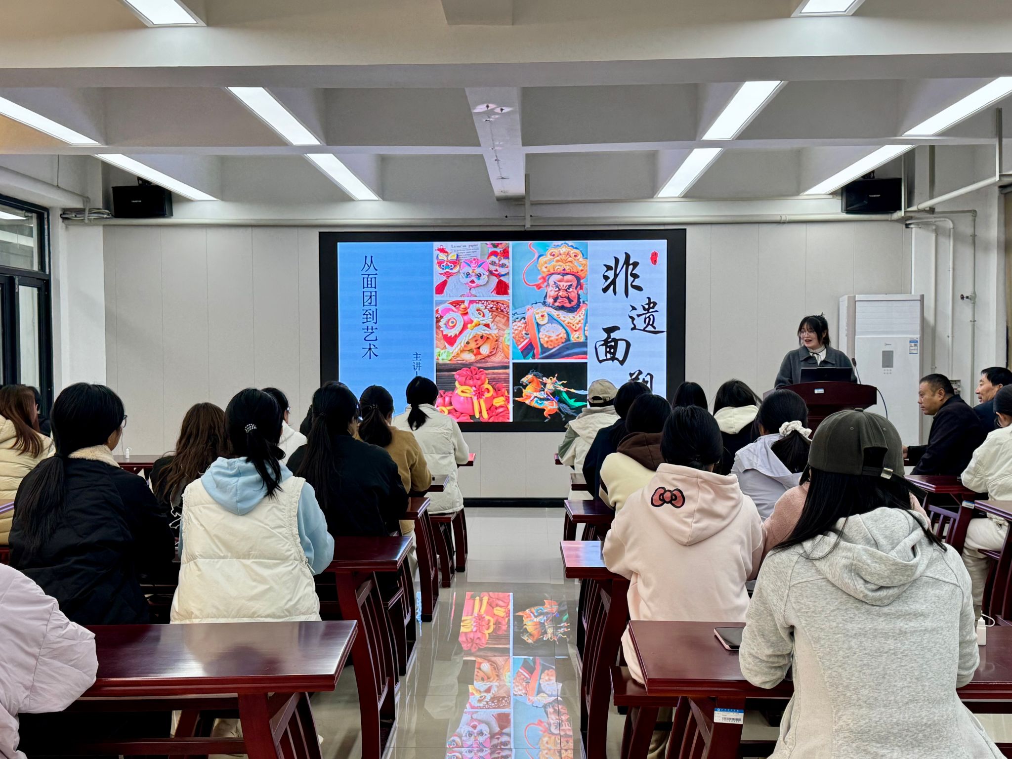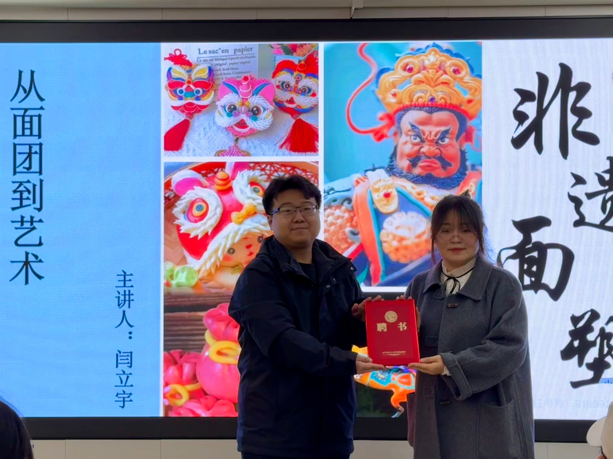 10月20日,第九期“非遗大讲堂”在书院三楼非遗馆隆重举行。本次活动特邀河南省民间艺术家协会会员、新乡市非遗面塑传承人闫立宇老师,以“从面团到艺术”为题,带领同学们一同走进五彩斑斓、栩栩如生的面塑世界,感受指尖传韵、面塑生花的非凡魅力。