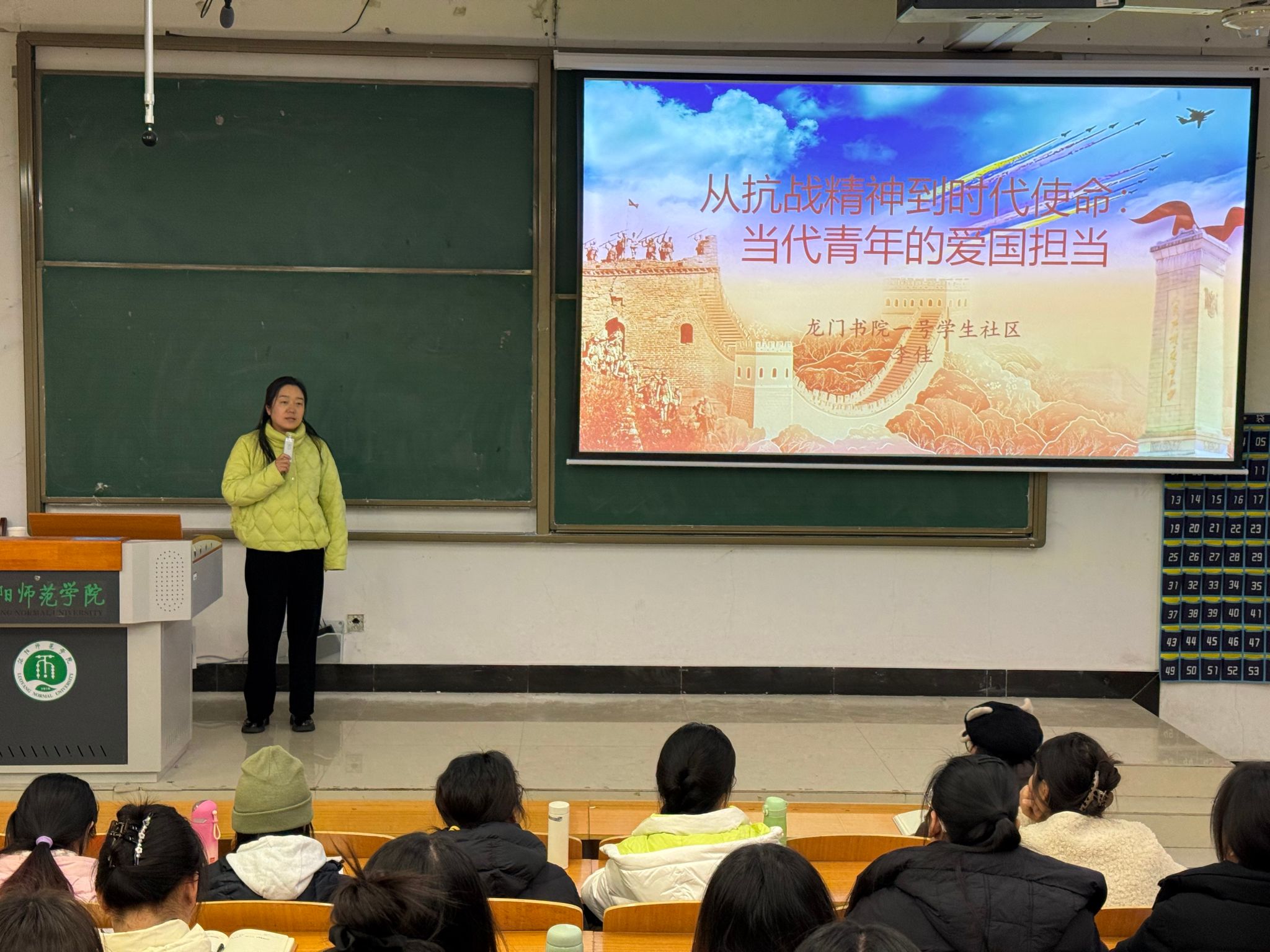 为引导新发展预备党员厚植爱国情怀、传承抗战精神, 12月30日晚,龙门书院一号学生社区在A2-104教室举办“从抗战精神到时代使命:当代青年的爱国担当”专题党课。本次党课由书院党委副书记李佳主讲,书院2025年下半年新发展预备党员参加学习。