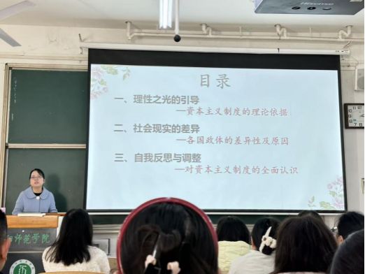 张景辉以“做有温度的历史教育者”为核心,结合自身经历,分享从教心得。她从教学理念、学情把握、课堂节奏等方面入手,阐述优质课堂的做法。随后,张老师以《资产阶级革命与资本主义制度的确立》为例,阐述了高中历史优质课程。其课件既有英国议会大厦等历史图片、制度确立时间线等图表,又穿插欧美各国资本主义政体差异性等案例,还模拟真实课堂设计互动,通过“资本主义制度的确立及发展变化能为我国当前的社会治理提供哪些经验”等问题引导学生思考,利用“小组辩论”“角色扮演”等形式,分享了优质课堂的构建过程。她提出“教学要基于课堂但不完全在课堂”的观点,强调可通过历史剧展演、博物馆参观等打破教室边界,引发学子共鸣。最后开展了互动环节,学生们围绕导学案应用、课件制作、AI 赋能等问题进行提问,张老师逐一详细解答。她建议导学案应围绕核心素养设计分层任务,课件制作优先考虑简洁性与逻辑性,还结合实例说明 AI 在作业批改、场景模拟中的应用,同时提醒“AI 是工具而非替代者”。
