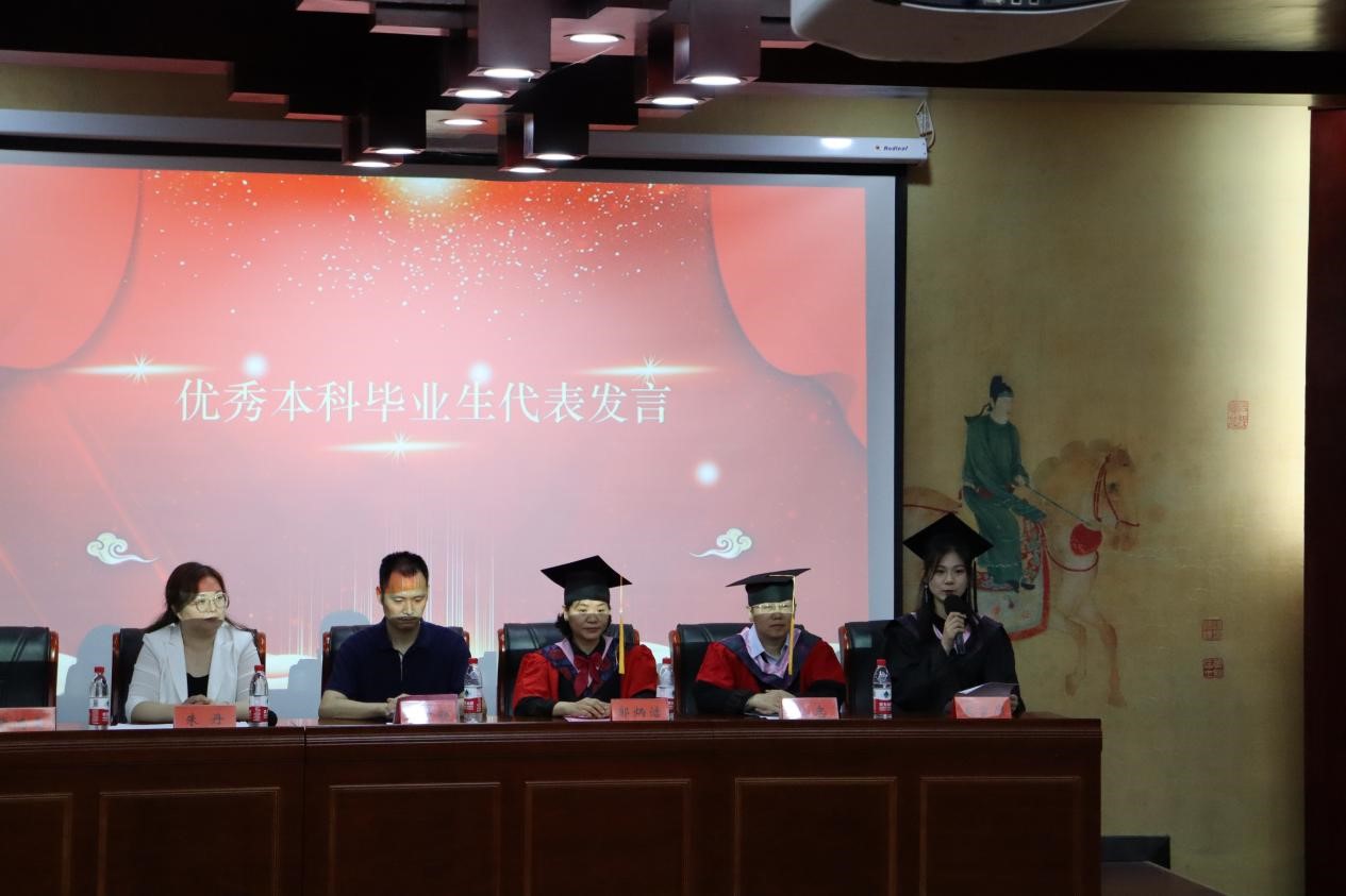 最后,院长郭炳洁致辞。她先对学院2024届全体毕业生顺利获得学位表示祝贺,并带领同学们回顾了在校园生活、学习的点点滴滴,为同学们在大学四年中取得的成绩而骄傲,同时也对同学们的未来提出了殷切希望。她寄语毕业生,首先要勇敢,无惧人生风浪,笑傲人生江湖;其次要担当,担起作为祖国建设者、接班人、家庭的顶梁柱等不同的角色;第三要有爱,爱自己、爱家庭、爱社会、爱祖国;第四要学习,永不停止探究的欲望,学习的脚步。希望我院毕业学子的光芒能够汇聚成实现中华民族伟大复兴的磅礴力量,祝愿大家此去一帆风顺,万里鹏程,生活美满。