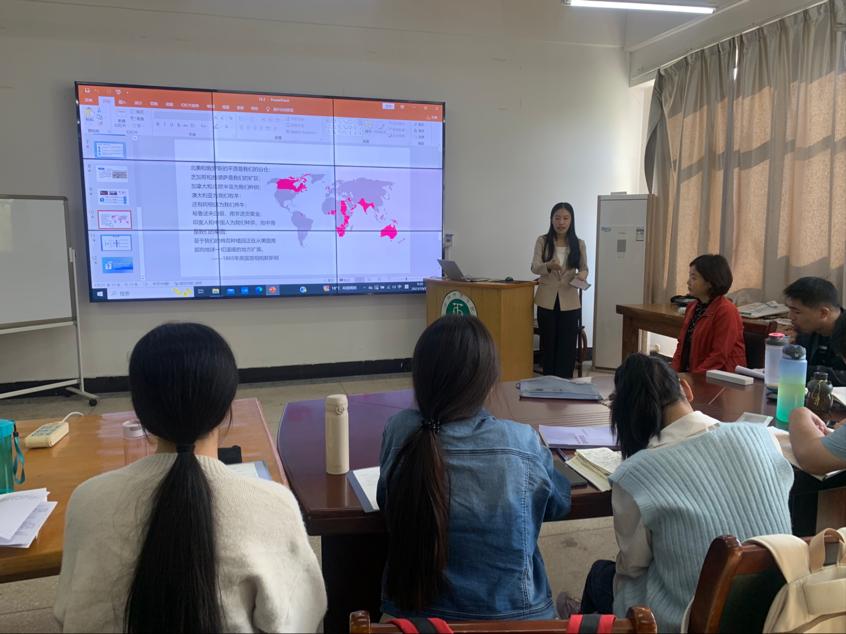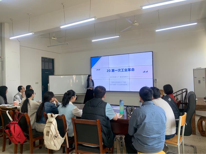 范子吟同学展示了本次参赛作品《第一次工业革命》微课。她分享了自己在赛前备课过程中遇到的问题与处理方法,提醒2023级的学弟学妹们应在内容的准备、教学设计、课件制作和模拟授课等方面注重细节、下足功夫,让内容有亮点、有深度、有升华并切实联系当下。最重要的是要仔细研读比赛规则和要求以及评分标准,有针对性的进行训练,避免在比赛中犯低级错误。