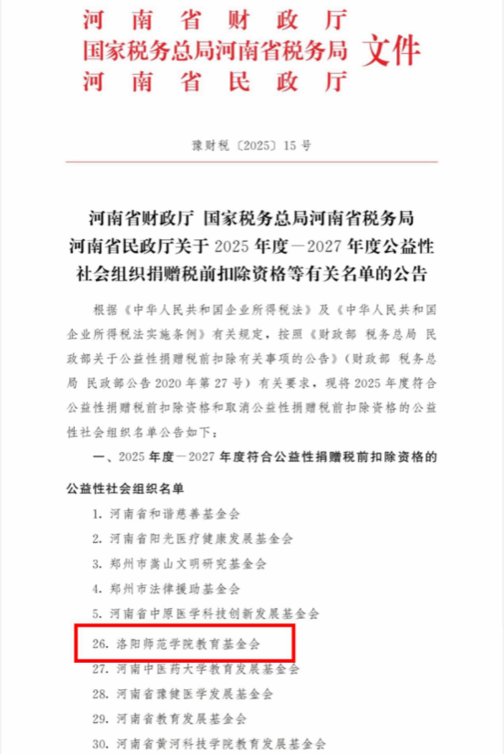 河南省财政厅、国家税务总局河南省税务局和河南省民政厅联合印发文件《关于2025年度公益性社会组织税前扣除资格名单的公告》(河南省财政厅公告〔2025〕15号),洛阳师范学院教育基金会荣获公益性社会组织捐赠税前扣除资格,有效期三年。