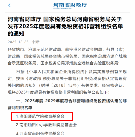 河南省财政厅与国家税务总局河南省税务局联合印发文件《关于2025年度第二批具有免税资格非营利性组织名单的公告》,洛阳师范学院教育基金会荣获非营利组织免税资格,有效期五年。