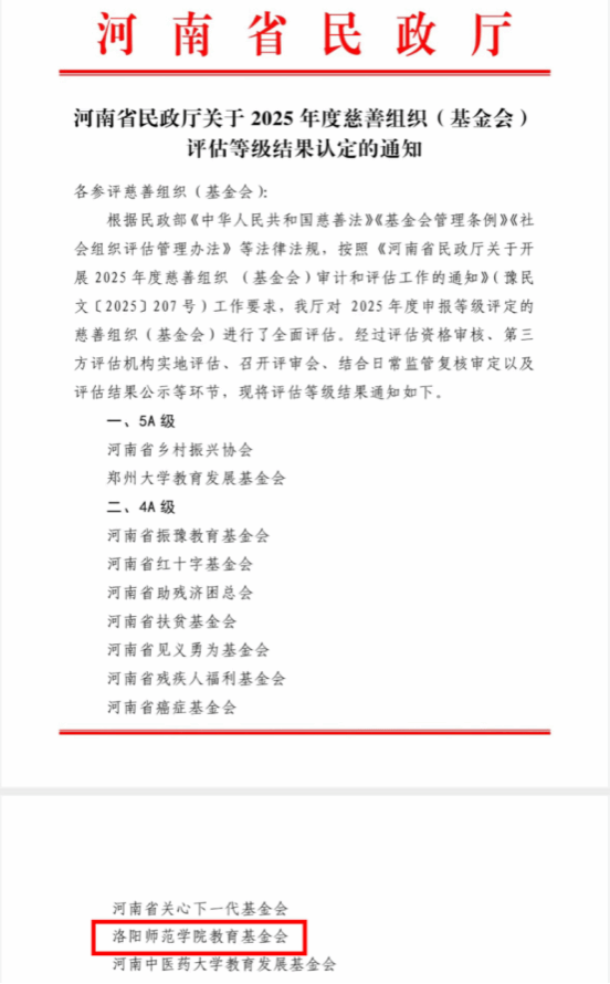 河南省民政厅组织的社会组织等级评估中,洛阳师范学院教育基金会由原先的3A等级成功晋升至4A等级,标志着组织建设与公信力实现了质的跨越。