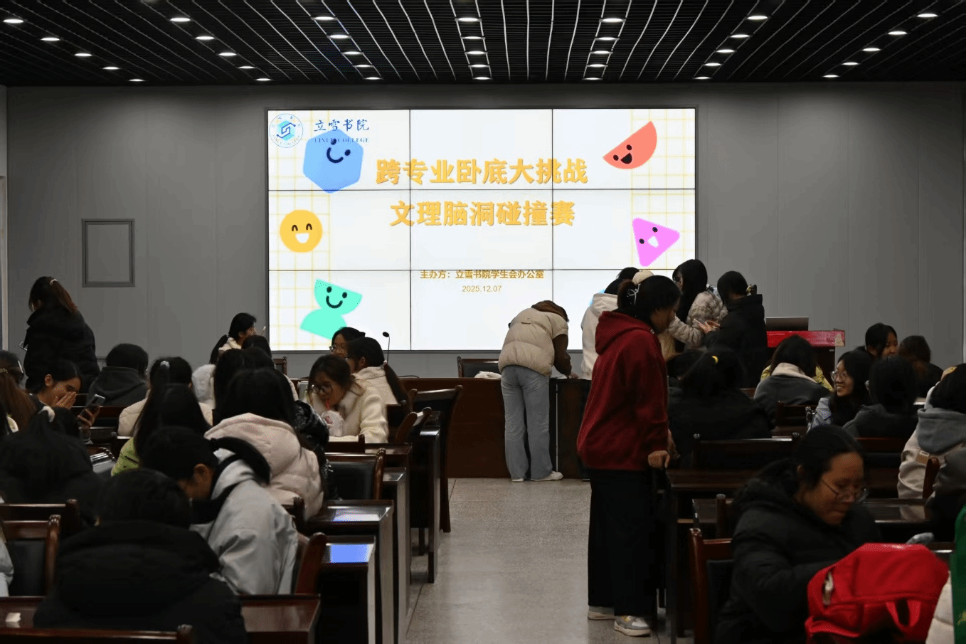 为丰富书院学子课余生活,促进不同学科间的交流,12月7日晚,立雪书院学生社区在化学楼215会议室举办跨专业卧底大挑战——文理脑洞碰撞赛趣味游戏。立雪书院学生社区学生会办公室互助一组工作人员罗跃主持,书院各专业学子积极参与。