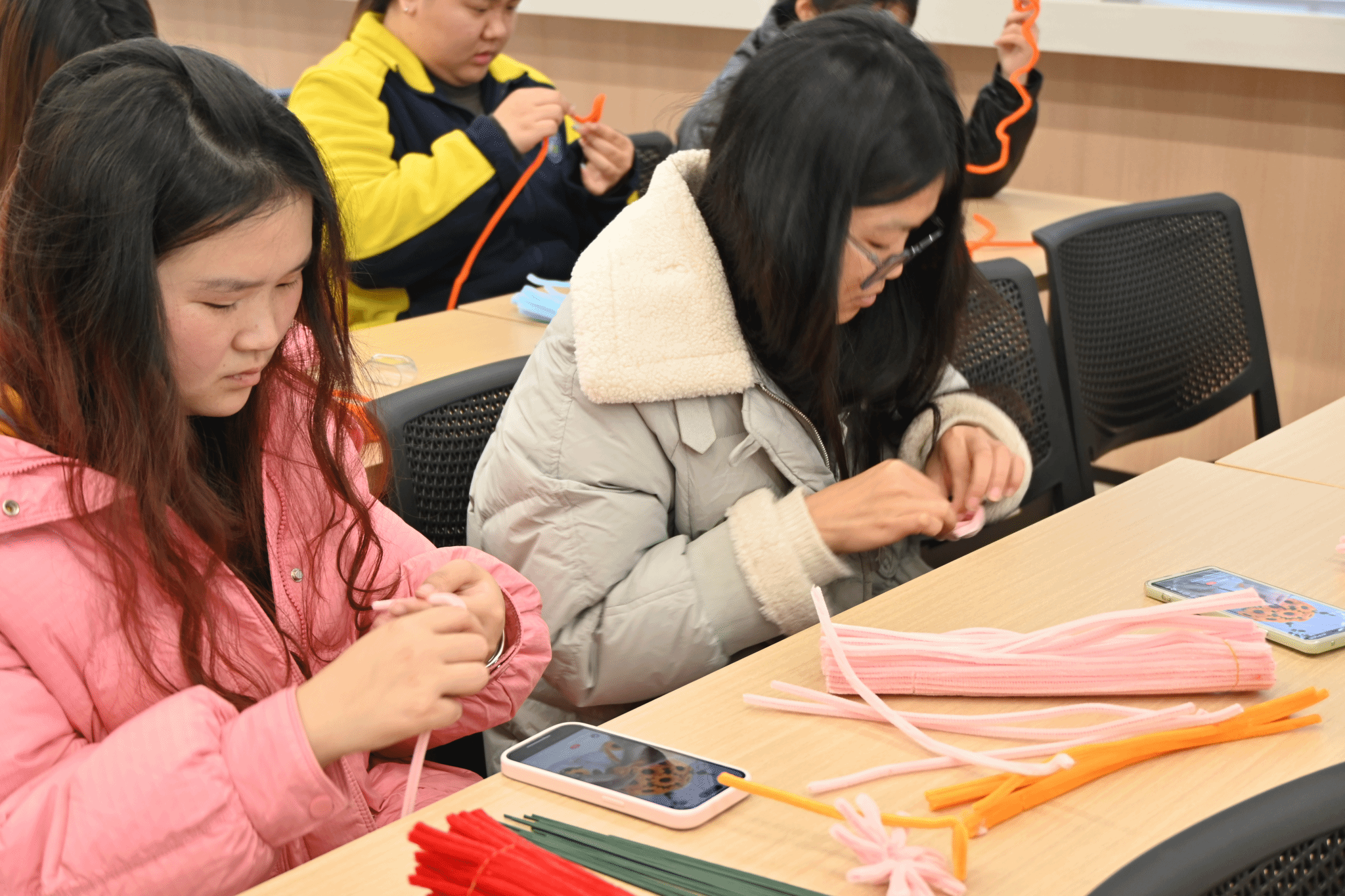 活动现场,工作人员将各色扭扭棒、剪刀和挂件等材料发给在场同学,并耐心讲解扭扭花的制作技巧。一根根色彩鲜艳的扭扭棒在同学们手中翻转,从花瓣塑形到花杆固定,通过弯折、缠绕、拼接等方式制作成一朵朵形态各异的扭扭花。制作完成后,同学们将扭扭花束送到了考研学子手中,并送上“一战成硕”“未来可期”“一举夺魁”“考研顺利”等祝福,朴实的话语里满含美好期许,为考研学子艰辛的备考之路增添了一份慰藉与力量。