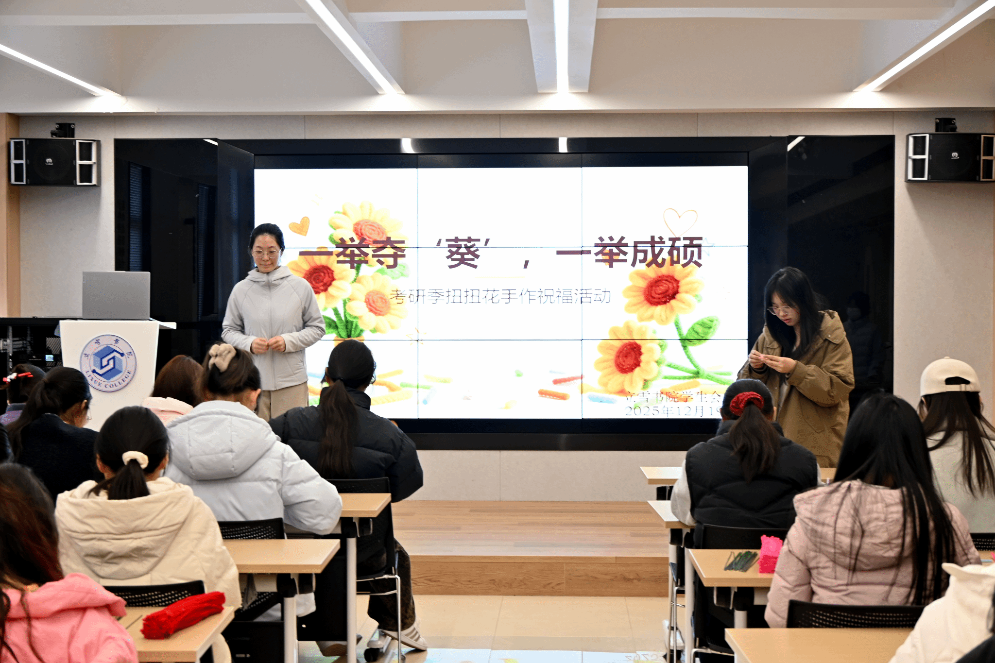 为缓解考研学子备考压力,传递温暖祝福,12月19日下午,立雪书院学生社区在立雪讲堂开展了“一举夺‘葵’,一举成硕”考研季扭扭花手作祝福活动。活动由立雪书院学生社区学生会生活权益部负责人杜凤主持,书院学子积极参与。