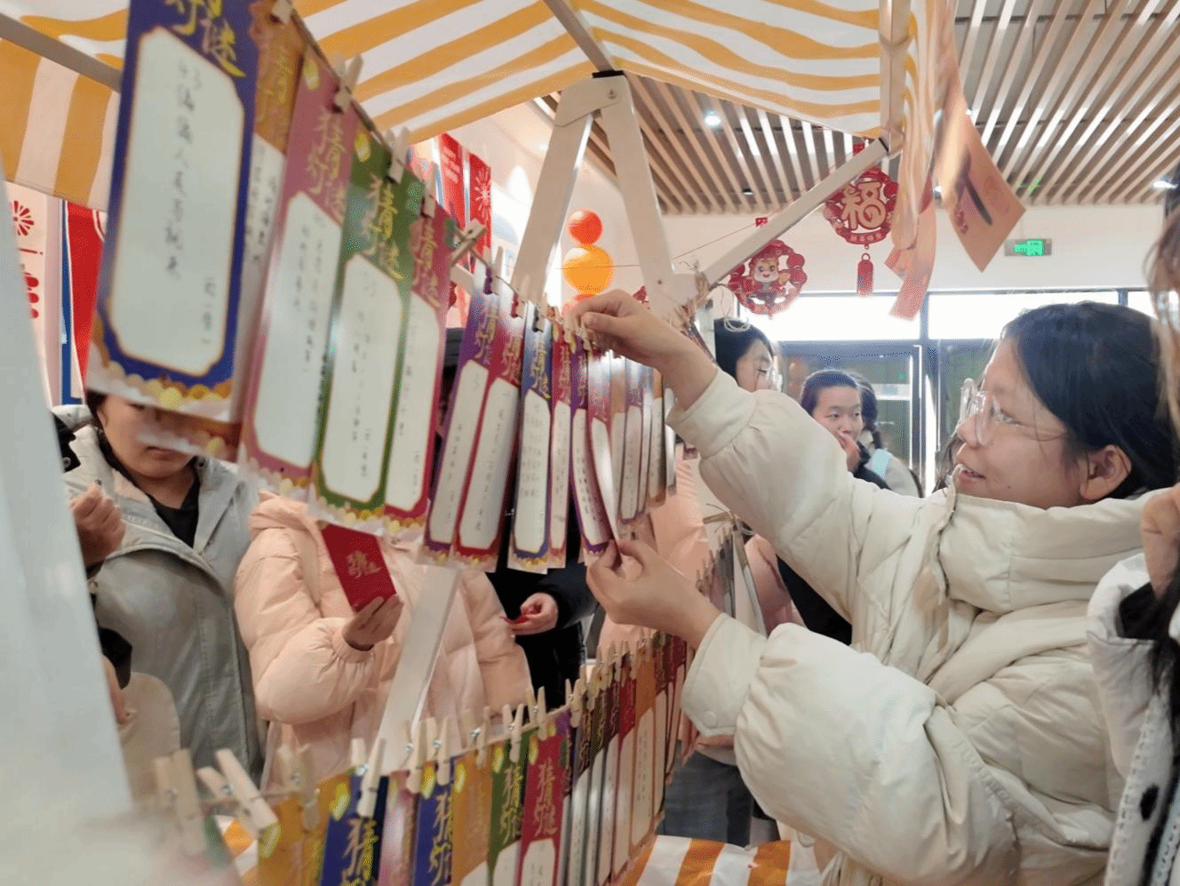 12月31日下午,书院一楼大厅热闹非凡,百余条融合“马”元素与新春民俗的灯谜悬挂于展架两侧,涵盖字谜、成语谜、民俗谜等多种类型。同学们驻足流连、凝神思索,或独自推敲,或三五成群讨论交流。猜中谜底的同学收获了精美的小礼品,现场欢声笑语不断。活动不仅带来了节日的趣味与挑战,更在愉悦中拉近了彼此距离,营造出浓厚的新春文化氛围。