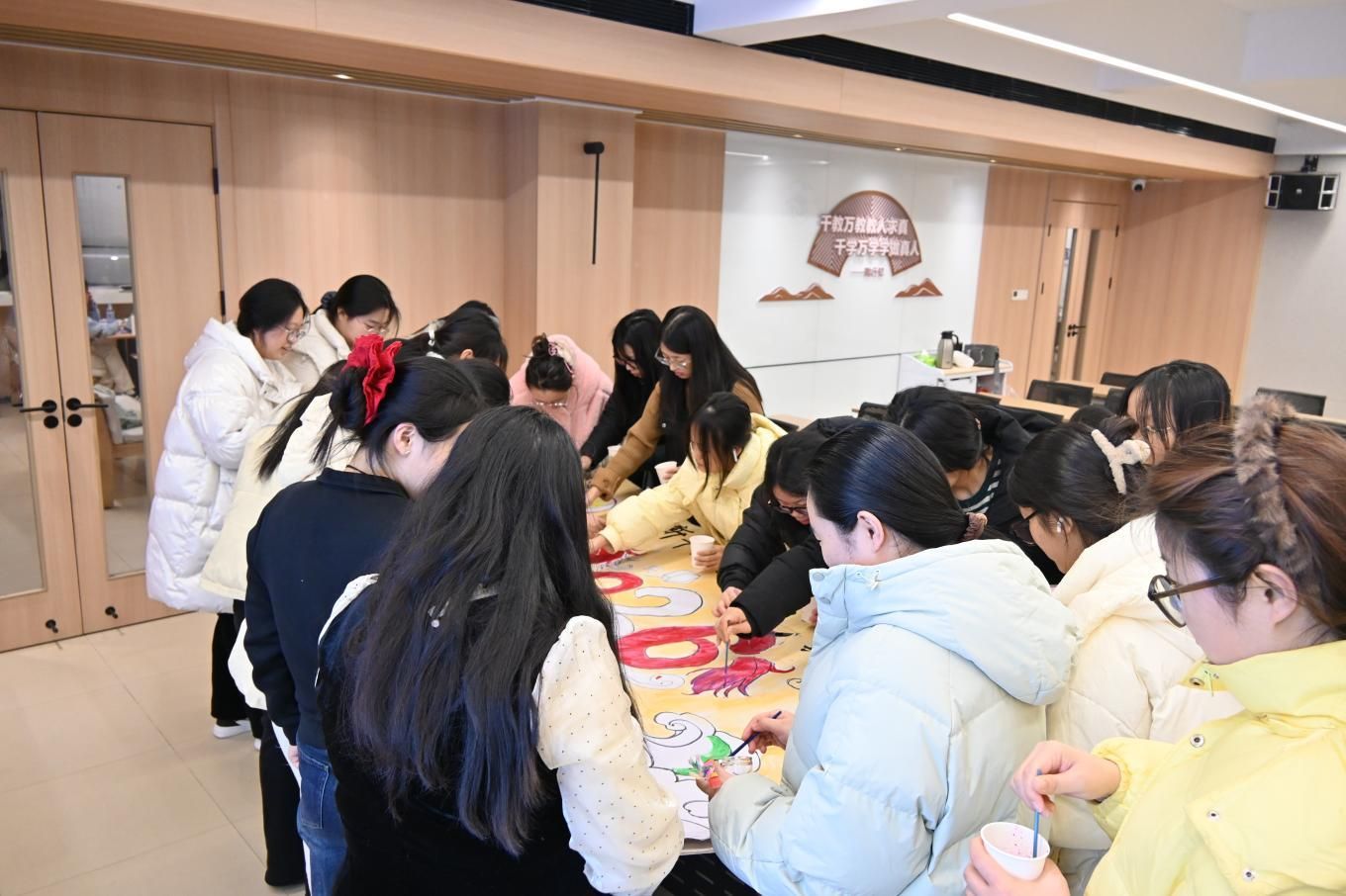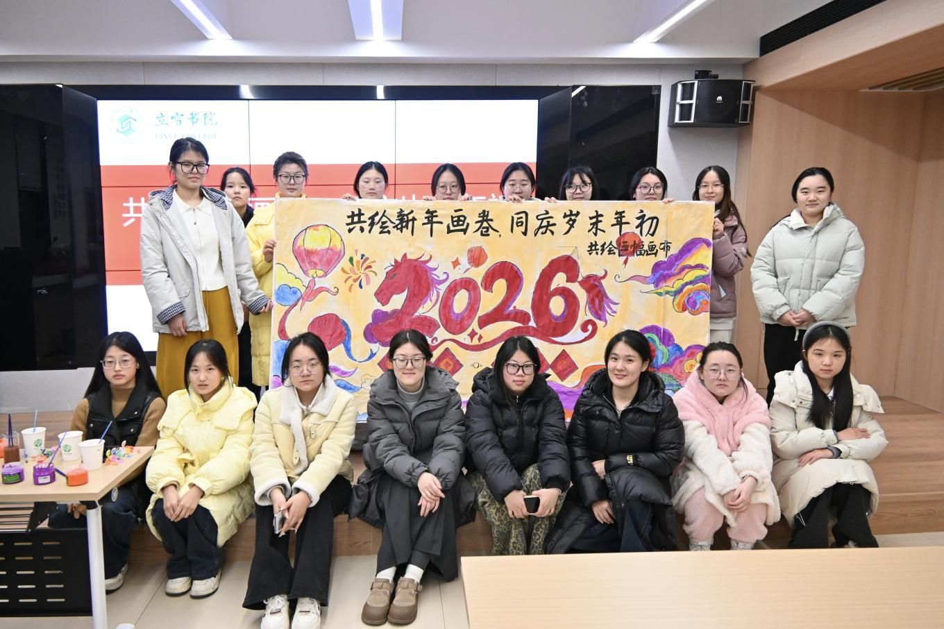 活动现场,学生围绕着一幅融合了2026马年生肖、新年祥纹与主题标语的画布。画布上,奔马造型与鲜红的“2026”字样相映成趣,祥云、灯笼等传统新春元素以灵动的笔触铺展,为整个创作现场定下温馨又热烈的基调。学子们环绕画布热烈讨论色彩搭配方案,逐渐将空白的画布演变为一件饱含新年美好期许与集体智慧结晶的艺术佳作。画笔的起落与笑语的交织,让这场绘画不仅是艺术的表达,更是一场温暖的新年相聚。