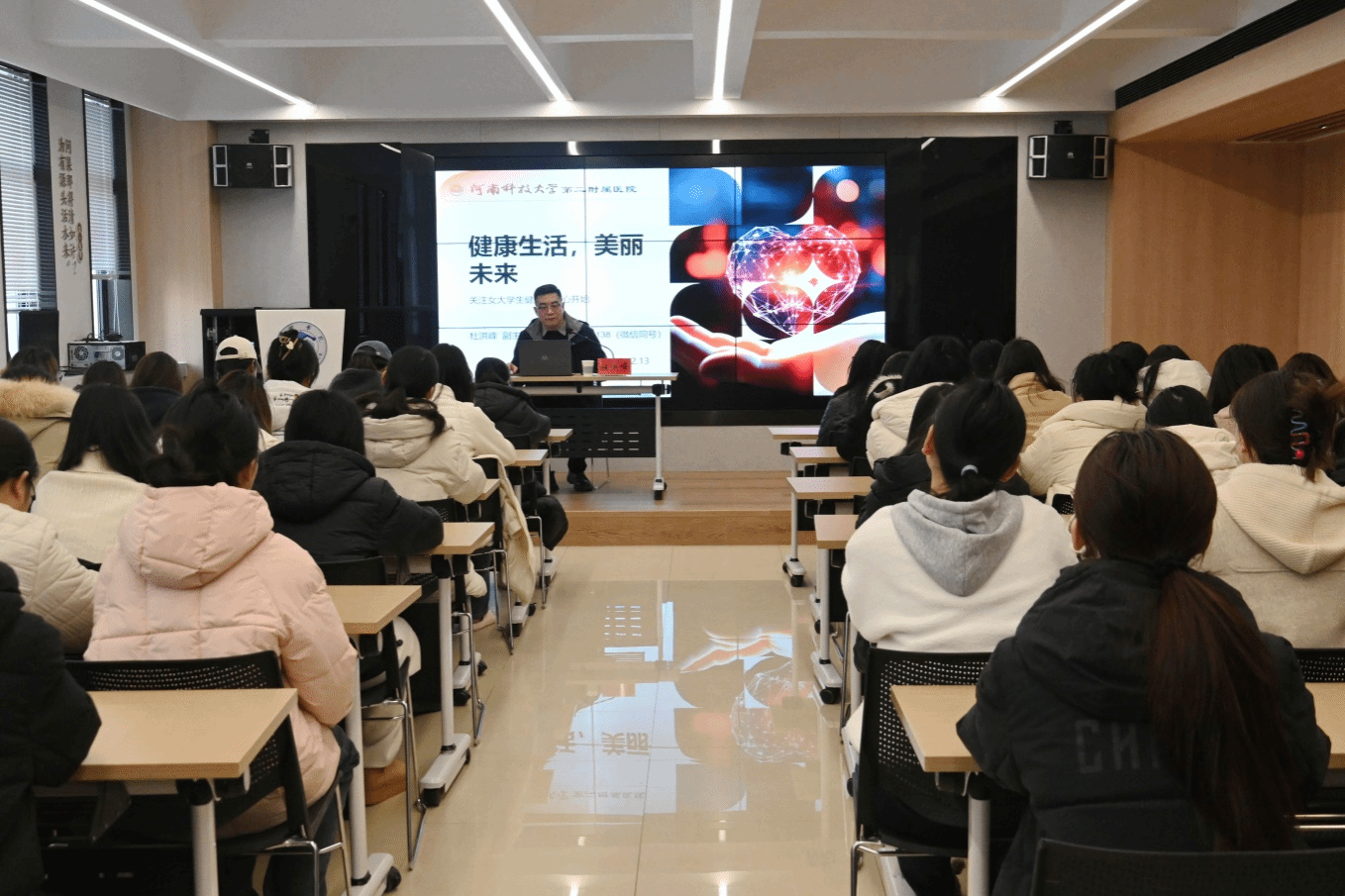 杜洪峰以“健康生活,美丽未来”为主题,聚焦女大学生群体,从心脑血管健康、过敏性体质调理和生理健康三方面入手,分析了熬夜、外卖依赖等生活习惯对心脑血管的潜在影响,介绍了过敏性体质的日常调理方法,并强调了生理健康的重要性,引导同学们树立科学健康的生活观念。